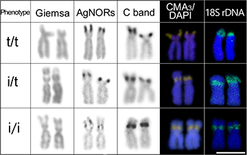 FIGURE 4| Three phenotypes of the NOR-bearing pair (pair 25) observed in Hemiancistrus fuliginosus from Antas River: stained by Giemsa, Ag-staining, C-banded, stained with CMA3/DAPI and subjected to fluorescent in situ hybridization with rDNA probes 18th patterns: terminal/terminal (t/t), interstitial/terminal (i/t) and interstitial/interstitial (i/i). Scale bar = 5µm.