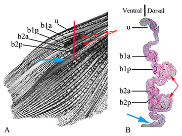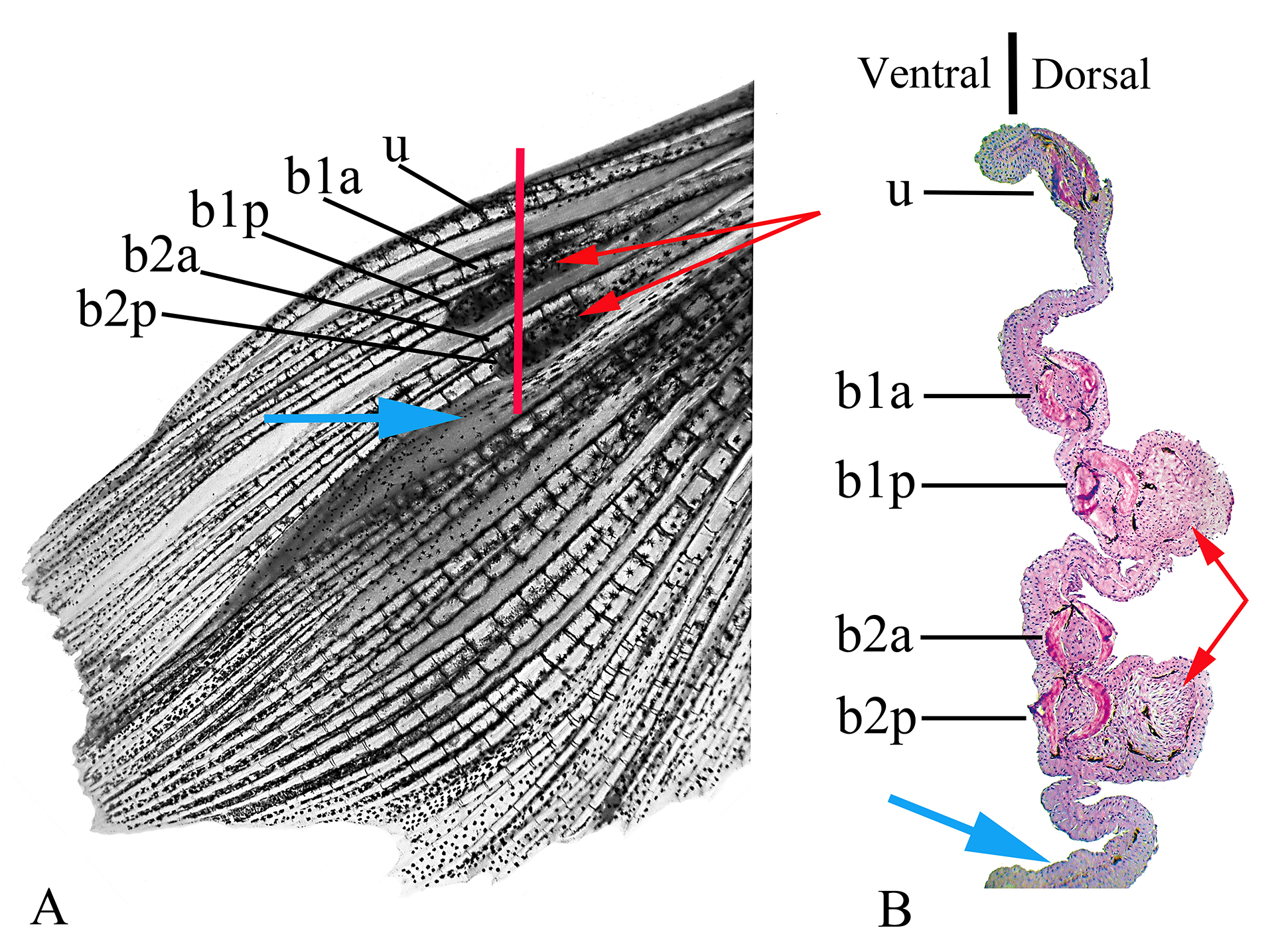 FIGURE 2| Left pectoral fin of a male of Rachoviscus crassiceps (MCP 37987, 38.2 mm SL). A. Dorsal view of the left pectoral fin before sectioning. B. Histological section of the same fin; the red line in “A”shows approximate location of illustrated sectioning. b1a = anterior branch of the first branched pectoral-fin ray; b1p = posterior branch of the first branched pectoral-fin ray; b2a = anterior branch of the second branched pectoral-fin ray; b2p = posterior branch of the second branched pectoral-fin ray; u = unbranched pectoral-fin ray; red arrows = thick tissues on the dorsal surface of the most proximal portion of the posterior branch of the first branched pectoral-fin ray and on the dorsal surface of the most proximal portion of the posterior branch of the second branched pectoral-fin ray; blue arrows = interradial membrane between the second and third branched pectoral-fin rays.