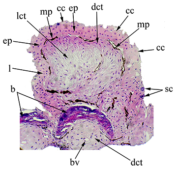 FIGURE 3| Transversal section of the posterior branch of the second branched pectoral-fin ray of Rachoviscus crassiceps (MCP 37987, 38.2 mm SL) showing the thick tissue located dorsally. Magnification: 400X. b = bone; bv = blood vessel; cc = club cells; dct = dense connective tissue; ep = epithelial tissue; l = lymphocyte; lct = loose connective tissue; mp = melanin pigments; sc = secretory cells.