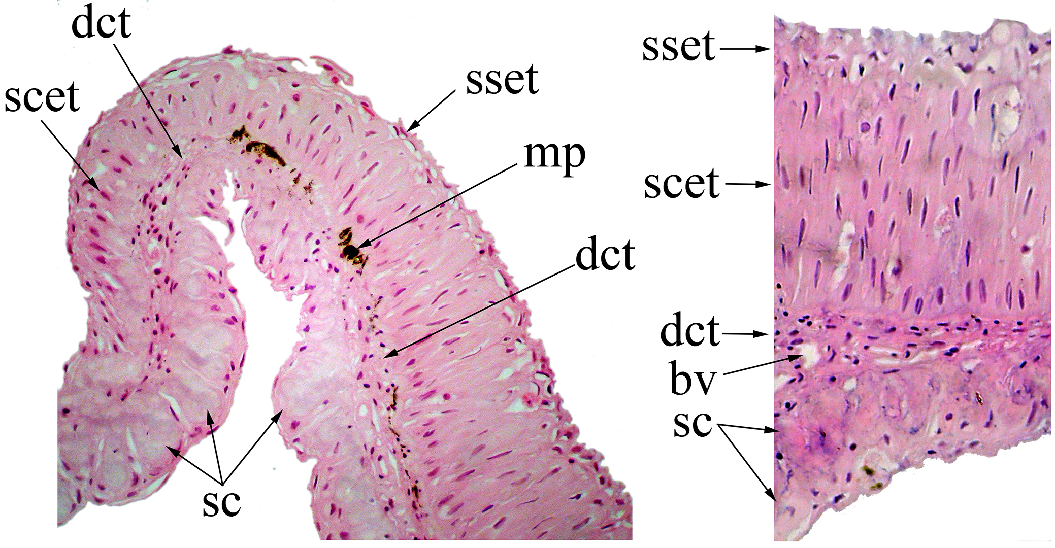 FIGURE 4| Section of the interradial membrane located between the second and third branched pectoral-fin rays of Rachoviscus crassiceps (MCP 37987, 38.2 mm SL) showing the stratified epithelial tissue on the dorsal surface and the secretory cells on the ventral surface of the interradial membrane. bv = blood vessel; dct = dense connective tissue; mp = melanin pigments; sc = secretory cells; scet = stratified columnar epithelial tissue; sset = stratified squamous epithelial tissue.