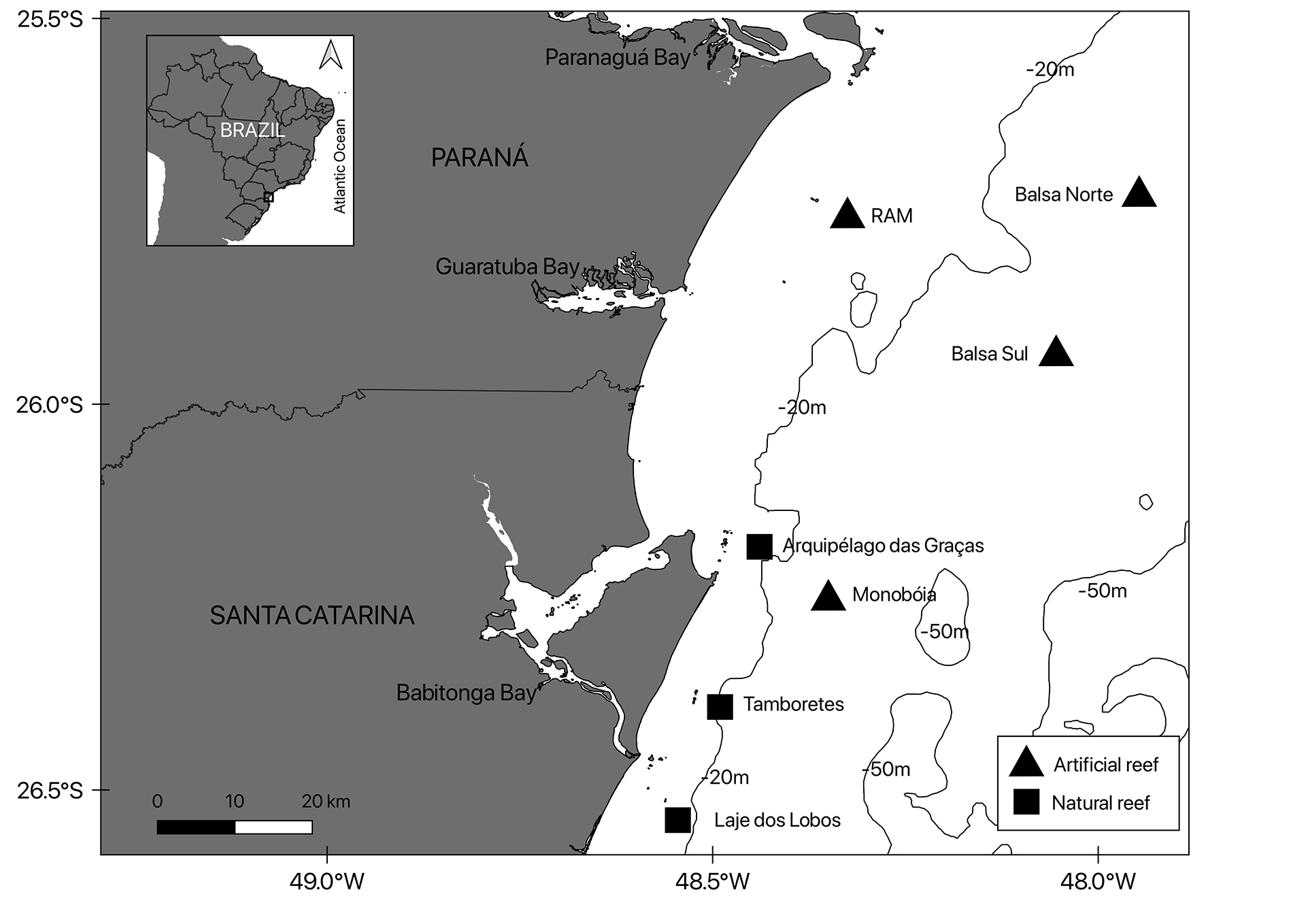 The natural reef sites (AG, TA and LL), are rocky reefs, close to coastal islands with a maximum depth of 19 m and presenting similar structural complexity and variable relief. These reefs are located in the northern region of the state of Santa Catarina.