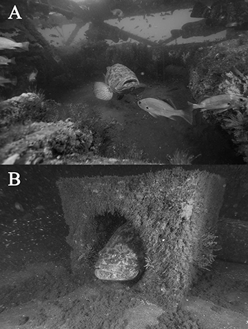FIGURE 2| Atlantic goliath grouper Epinephelus itajara on artificial reefs in southern Brazil. A. Using the bottom structure under the Monobóia (MB); B. Seeking shelter in a quadrilateral-shape artificial reef on Recifes Artificiais Marinhos (RAM). Photos by Leonardo S. Bueno.