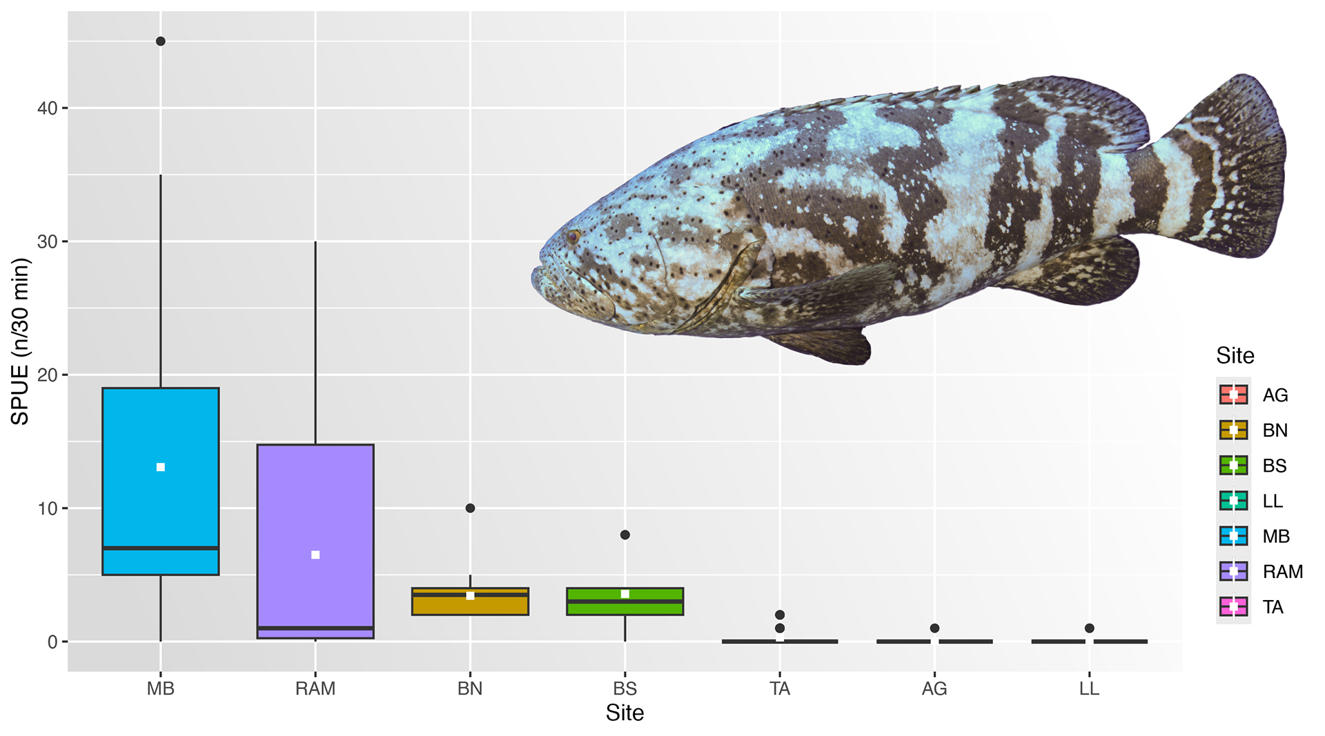 FIGURE 3| Boxplots of Atlantic goliath grouper Epinephelus itajara abundances by sampled sites: Artificial reefs (Monobóia (MB), N = 52; Recifes Artificiais Marinhos (RAM), N = 62; Balsa Norte (BN), N = 30; Balsa Sul (BS), N = 16) and natural rock reefs (Tamboretes (TA), N = 65; Arquipélago das Graças (AG), N = 40; Laje dos Lobos (LL), N = 51) in southern Brazil. RDT data pooled from 2007 to 2014. Black dots = outliers, horizontal line in box = median, white box = mean values.