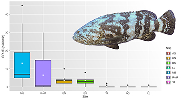 According to the local fishers, the natural reefs around AG, TA and LL were historically known as AGG spawning aggregation sites, with more than 60 AGG being seen on one site in a single day. LL was the site with the highest abundance of AGG (> 60) followed by TA (~15), and AG (~5) (Gerhardinger et al., 2009). Our surveys on these sites (LL, TA and AG) showed much lower abundance (highest SPUE; TA, 2; LL, 2 and AG, 1) and low frequency of occurrence (TA, 22%; LL, 4% and AG, 3%) even during the reproductive period (spring and summer). Such abundances suggest there is no longer a formation of spawning aggregations.