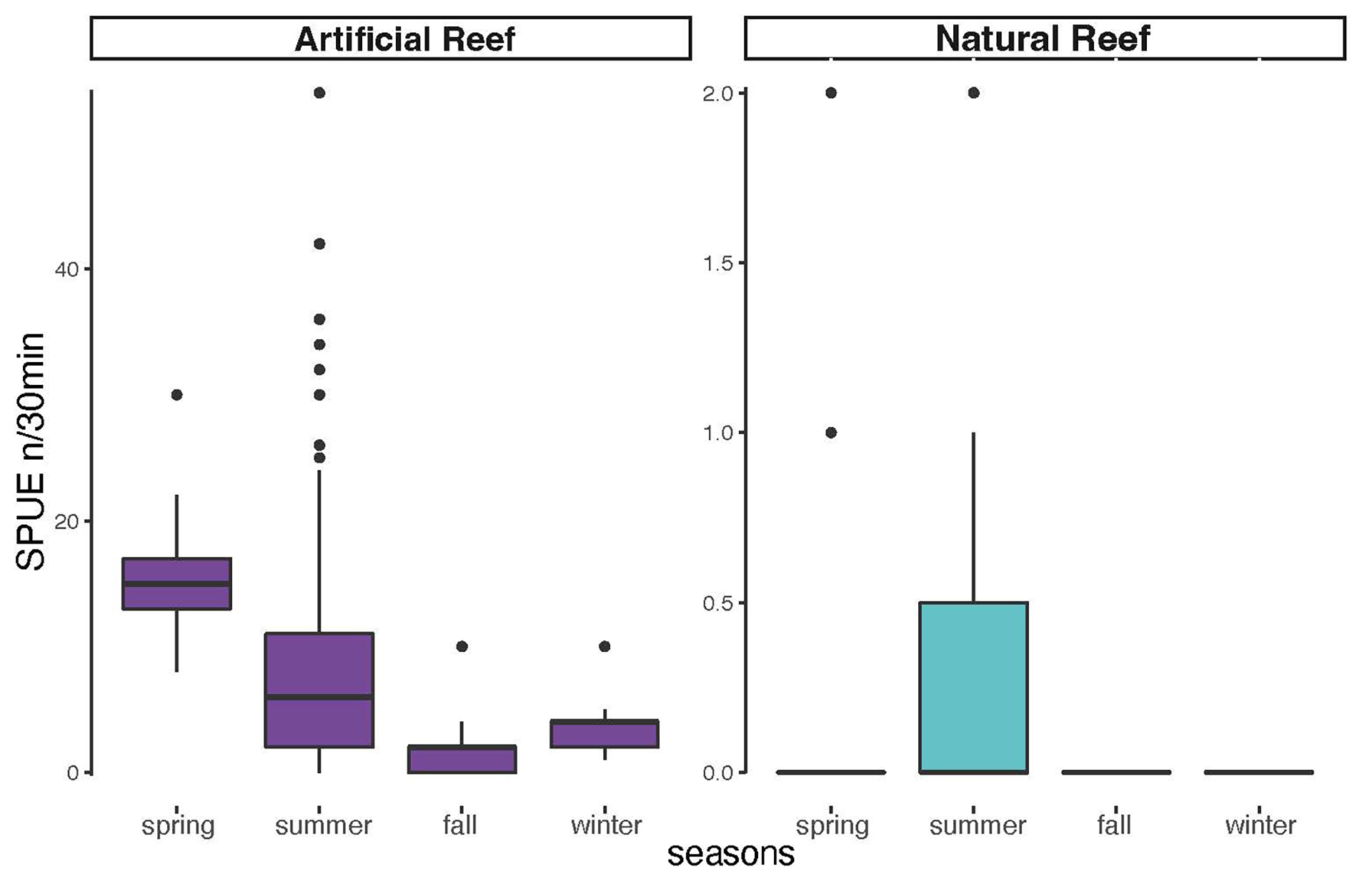 FIGURE 4| Boxplots of Atlantic goliath grouper Epinephelus itajara abundances by season in all sampled sites in southern Brazil divided into artificial reef group in purple (Monobóia, RAM, Balsa Norte, and Balsa Sul) (Spring N = 27; Summer N = 85; Fall N = 35; Winter N = 13) and natural reef group in teal (Tamboretes, Arquipélago das Graças, and Laje dos Lobos) (Spring N = 37; Summer N = 51; Fall N = 58; Winter N = 10), pooled years 2007 to 2014. Black dots = outliers, horizontal line in box = median.