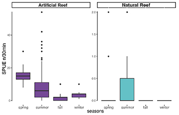 Comparing the abundances on natural and artificial reefs by seasons, AGG were more abundant in artificial reefs in all seasons. The artificial reefs had a higher abundance during spring and summer relative to fall and winter, whereas natural reef abundance remained low during all seasons (Fig. 4).