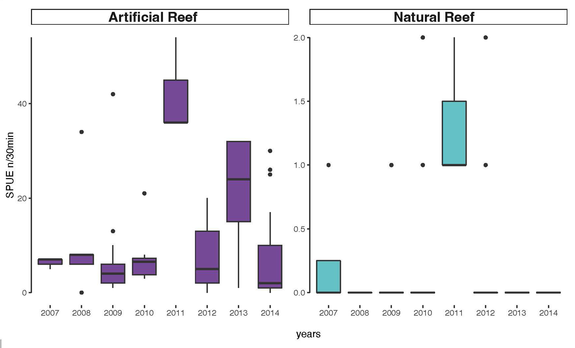 FIGURE 5| Boxplots of Atlantic goliath grouper Epinephelus itajara abundances in southern Brazil from 2007–2014 in all sampled sites divided into artificial reefs in purple (Monobóia, Recifes Artificiais Marinhos, Balsa Norte, and Balsa Sul) and natural reefs in teal (Tamboretes, Arquipélago das Graças, and Laje dos Lobos). Black dots = outliers, horizontal line in box = median.