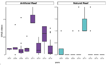 The AGG abundance on artificial reefs was significantly (p < 0.05) higher than on natural reefs (Tab. 2). Maximum values of SPUE showed large differences, the artificial reefs being more abundant than the natural reefs group (Fig. 3). Except for MB and RAM in the artificial reefs group, no statistically significant differences (p < 0.05) were observed among the reef sites of each group. However, the groups were significantly different (p < 0.05) from one another (Tab. 2).