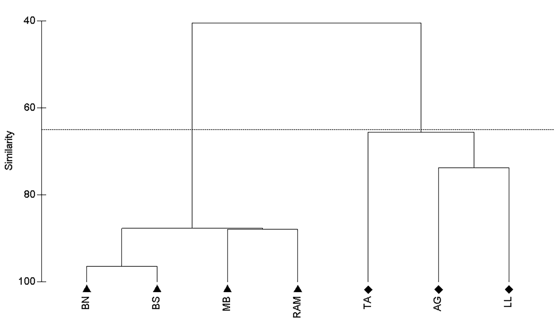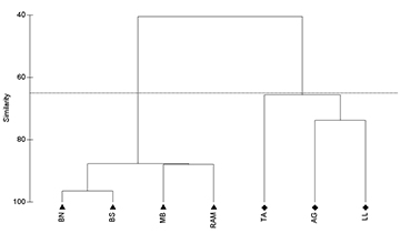 FIGURE 6| Atlantic goliath grouper Epinephelus itajara abundance on southern Brazil study sites displayed in a similarity cluster diagram. Balsa Norte (BN); Balsa Sul (BS); Monobóia (MB); Recifes Artificiais Marinhos (RAM); Tamboretes (TA); Arquipélago das Graças (AG); Laje dos Lobos (LL). Triangles () represent artificial reefs and diamonds (♦) represent natural reefs. Horizontal line defined at 67 % of similarity.