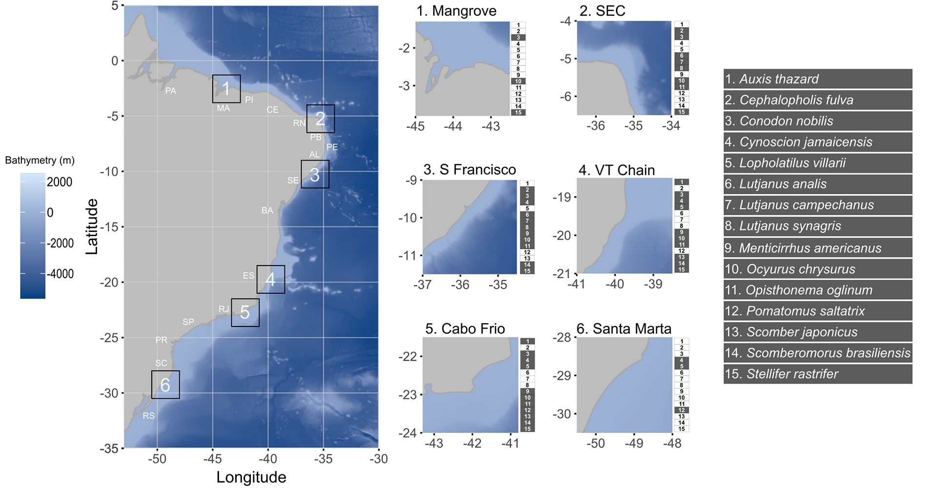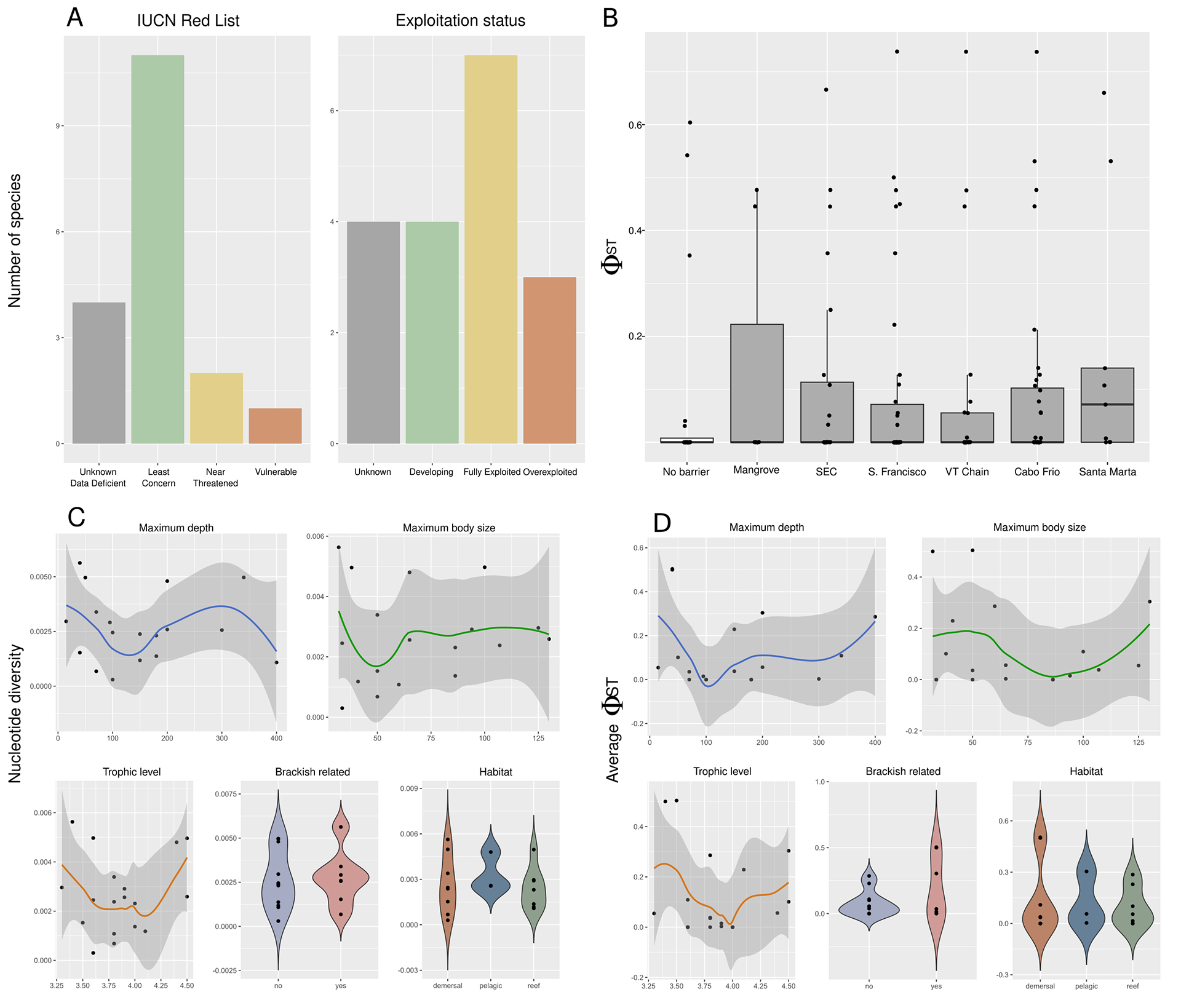 To address the hypothesis that fishes with different traits are differentially structured along the Brazilian coast, we investigated the genetic diversity and structure along with the demographic history of 15 exploited fish species in tropical and subtropical regions of Brazil using mitochondrial sequences (cytochrome c oxidase subunit I – COI – and cytochrome B – Cytb). Brazil has an extensive coastline with significant heterogeneity in temperature, productivity, and freshwater outflows, which can potentially restrict the gene flow. The 15 species selected for this study have different natural histories and ecological attributes that we predict may affect their genetic patterns. These include different trophic levels, maximum body size, bathymetric distribution, habitat, and dependence on estuary areas. Here, we aim to test the effects of six existing barriers on the patterns of genetic diversity and population structure changes in the effective population size of fifteen commercially important fish species. We expect species that live in shallow water, with smaller body sizes, living in brackish water, reef, and demersal areas to show higher genetic structuring than those with larger body sizes and high dispersal capability, at least as a legacy of past sea-level changes.