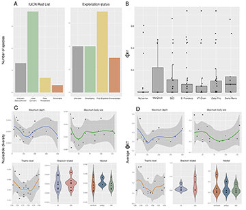 Life history, exploitation status and genetic diversity. We found no significant difference in either ΦST-sites or nucleotide diversity between species in different habitats (Figs. 2C–D). We also found no significant correlation between genetic and continuous life history measures (depth, maximum body size, and trophic levels), or exploitation status (Population trend, Red List status, or Exploitation status).