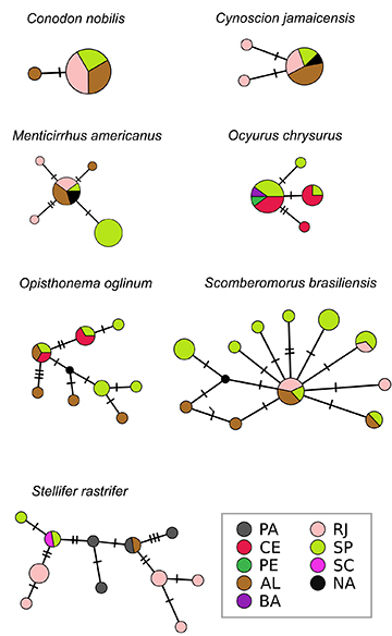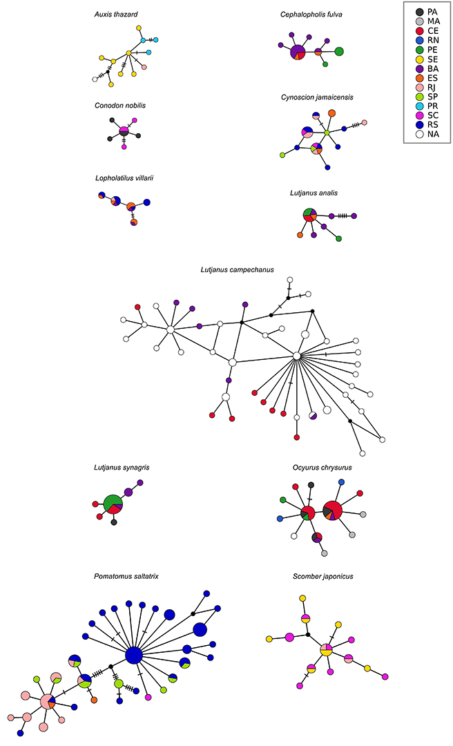 FIGURE 4| Cytochrome oxidase I haplotype networks for each commercially marine fish species. Abbreviations refer to Brazilian coastal states: PA – Pará, CE – Ceará, PE – Pernambuco, AL – Alagoas, BA – Bahia, RJ – Rio de Janeiro, SP – São Paulo, SC – Santa Catarina. Individuals collected in unknown locations are marked in white as NA.