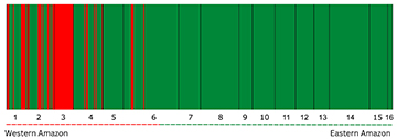 FIGURE 2| Biological population groups estimated by Bayesian analysis of population structure in the program BAPS. BAPS partitioned individuals into two biological groups Ln likelihood = −1010.1271, represented by the red (western populations), and green bars (eastern populations) and also delimited by dashed lines; thickness of bar is correlated to the number of individuals. Geographic localities are separated by vertical black lines. 1.Tabatinga; 2. Fonte Boa; 3. Juruá; 4. Tefé; 5. Coari; 6. Purus; 7. Humaitá; 8. Manaus; 9. Janauacá; 10. Borba; 11. Nhamundá; 12. Oriximiná; 13. Alenquer; 14. Santarém; 15. Ituqui, and 16. Jari.