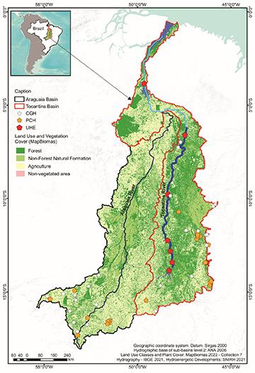 FIGURE 1| The Tocantins-Araguaia Basin. The map indicates drainage limits (Tocantins and Araguaia), the studied sections (dark blue = upper/middle Tocantins; soft blue = lower Tocantins; black = Araguaia Basin), land cover categories, and operational small (CGH and PCH) and large dams (UHE).