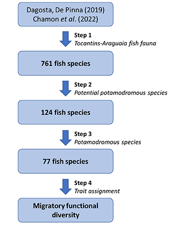 FIGURE 2| Methodology used (four steps) to identify potamodromous fishes in the Tocantins-Araguaia Basin, generating data to assess taxonomic and functional diversity.