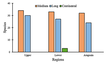 We consolidated a list of 77 potamodromous species in the Tocantins-Araguaia basin (Tab. 1), which include fish of different sizes, shapes, behavior, and lineages (Fig. 3). These fishes belonged to three orders, Clupeiformes (S = 02 species), Characiformes (S = 42) and Siluriformes (S = 33), 12 families, and 41 genera. Pimelodidae was the most species-rich family (S = 25), followed by Serrasalmidae (S = 15), and Curimatidae (S = 10); other families had less than three species (Tab. 1). Most species (S = 69) were widely distributed across the basin; eight were endemic, three threatened with extinction, and two non-natives (the tambaqui Colossoma macropomum and the pacu Piaractus mesopotamicus). Most species were classified as medium (S = 42) and long-distance (S = 32) migrants, and few as continental migrants (S = 03); this proportion was similar between regions (Fig. 4), excepting for continental migrants, recorded only in the lower Tocantins. We recorded 64 species in the upper and lower Tocantins, and 56 in the Araguaia; taxonomic composition was very similar between the three regions (Tab. 2).