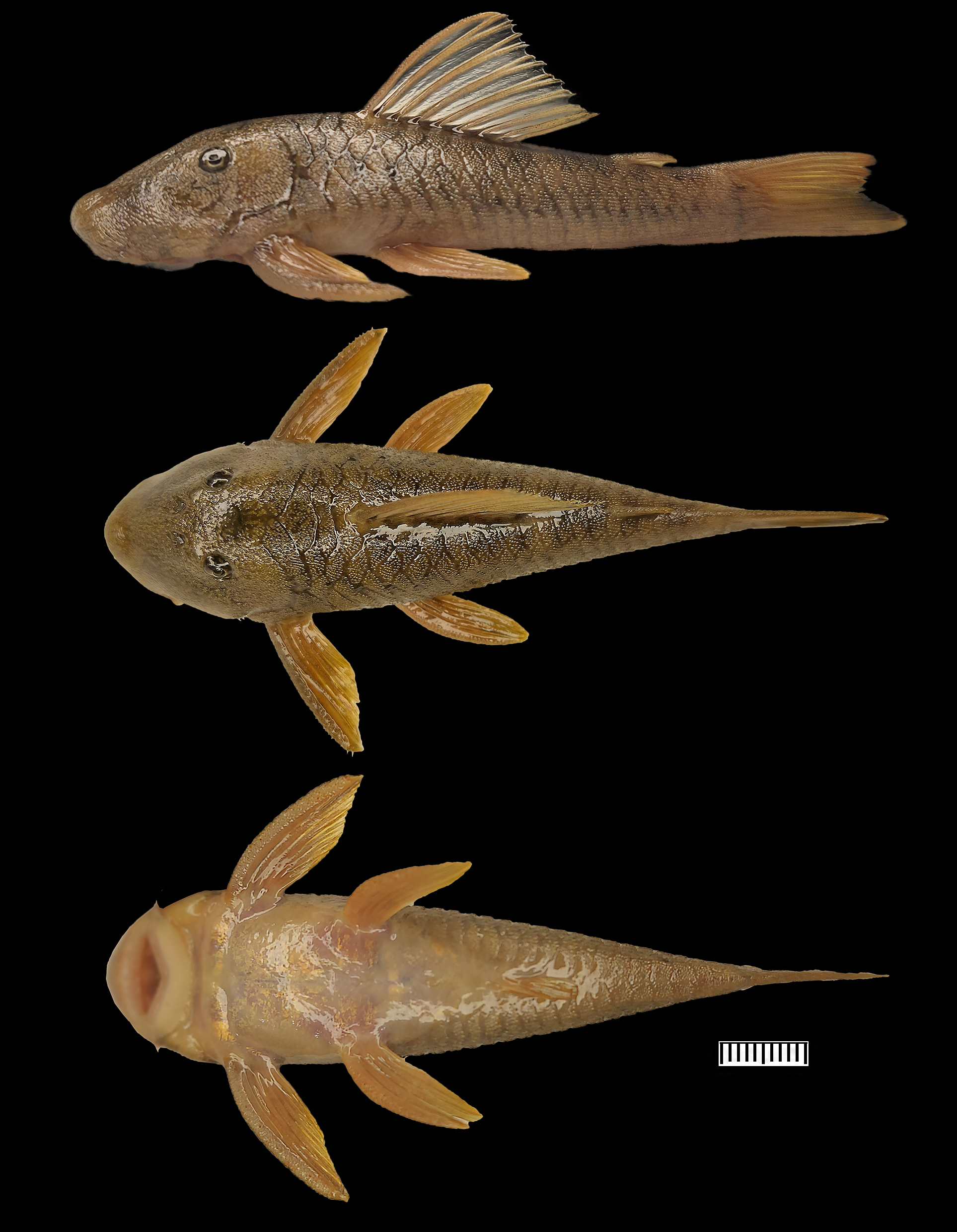 FIGURE 1| Chaetostoma bifurcum: dorsal (top), lateral (middle), and ventral (bottom) views. The bony plates covering the body and the distinct suckermouth, characteristic of the genus Chaetostoma, are visible, illustrating the adaptations of the species for adhering to rocky substrates in fast-flowing rivers. Scale bar = 10 mm.