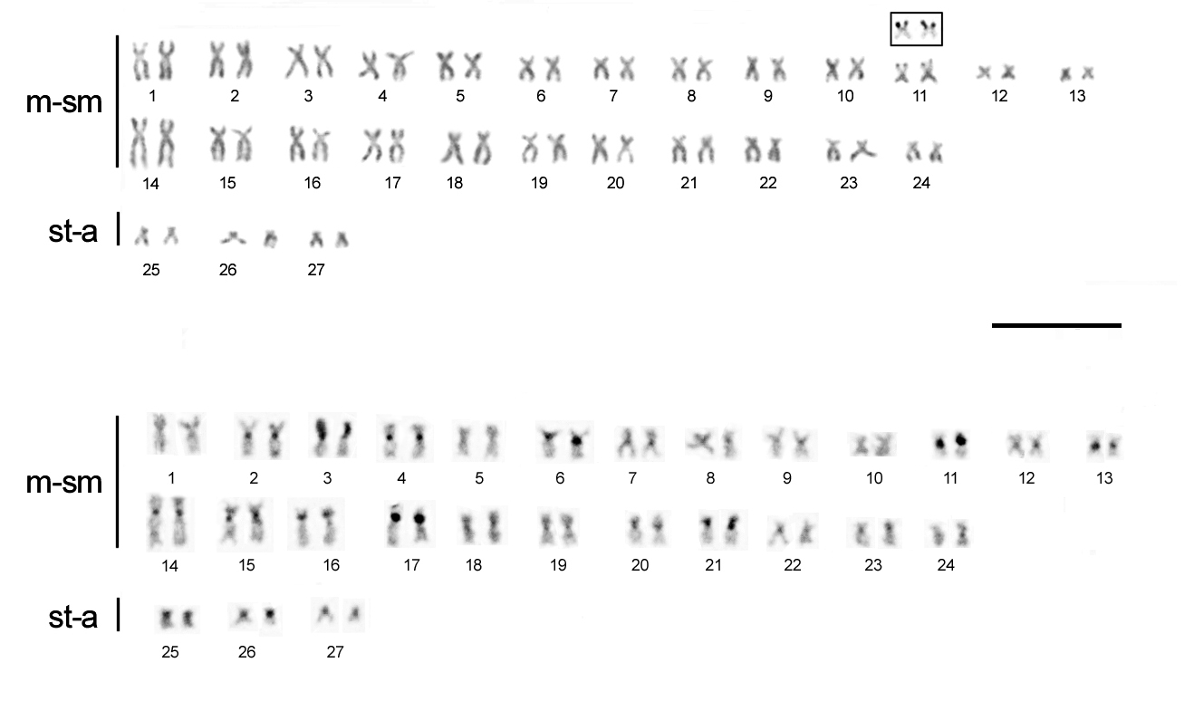 st-a, and a fundamental number (FN) of 102 (Fig. 2). Silver nitrate impregnation revealed a unique pair of transcriptionally active nucleolus organizer regions (NORs), present at a distinct secondary constriction located on the short arm of the submetacentric pair 11 (Fig. 2A, boxed). C-banding revealed blocks of constitutive heterochromatin in all chromosomes, located in the centromeric and pericentromeric regions (Fig. 2B). A distinct heterochromatic block was consistently observed on the short arm of chromosome pair 3. No differences were found between males and females concerning their heterochromatin distribution.