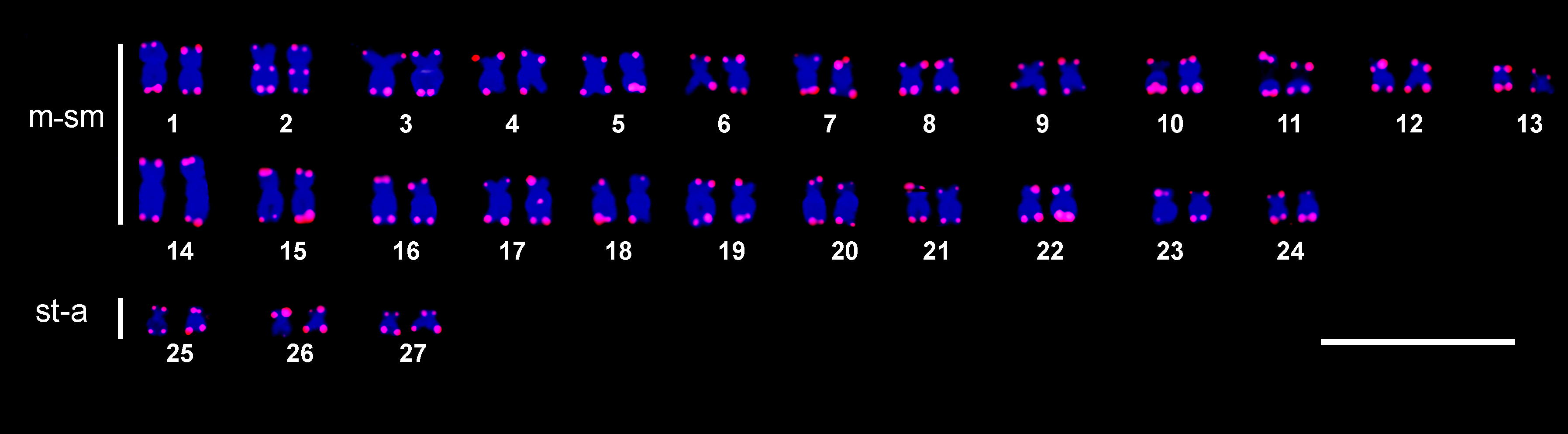 FIGURE 4| Chaetostoma bifurcum karyotype after fluorescence in situ hybridization using telomeric probes TTAGGGn. Faint ITSs are visible on chromosome pair number 2. Scale bar = 10 µm.