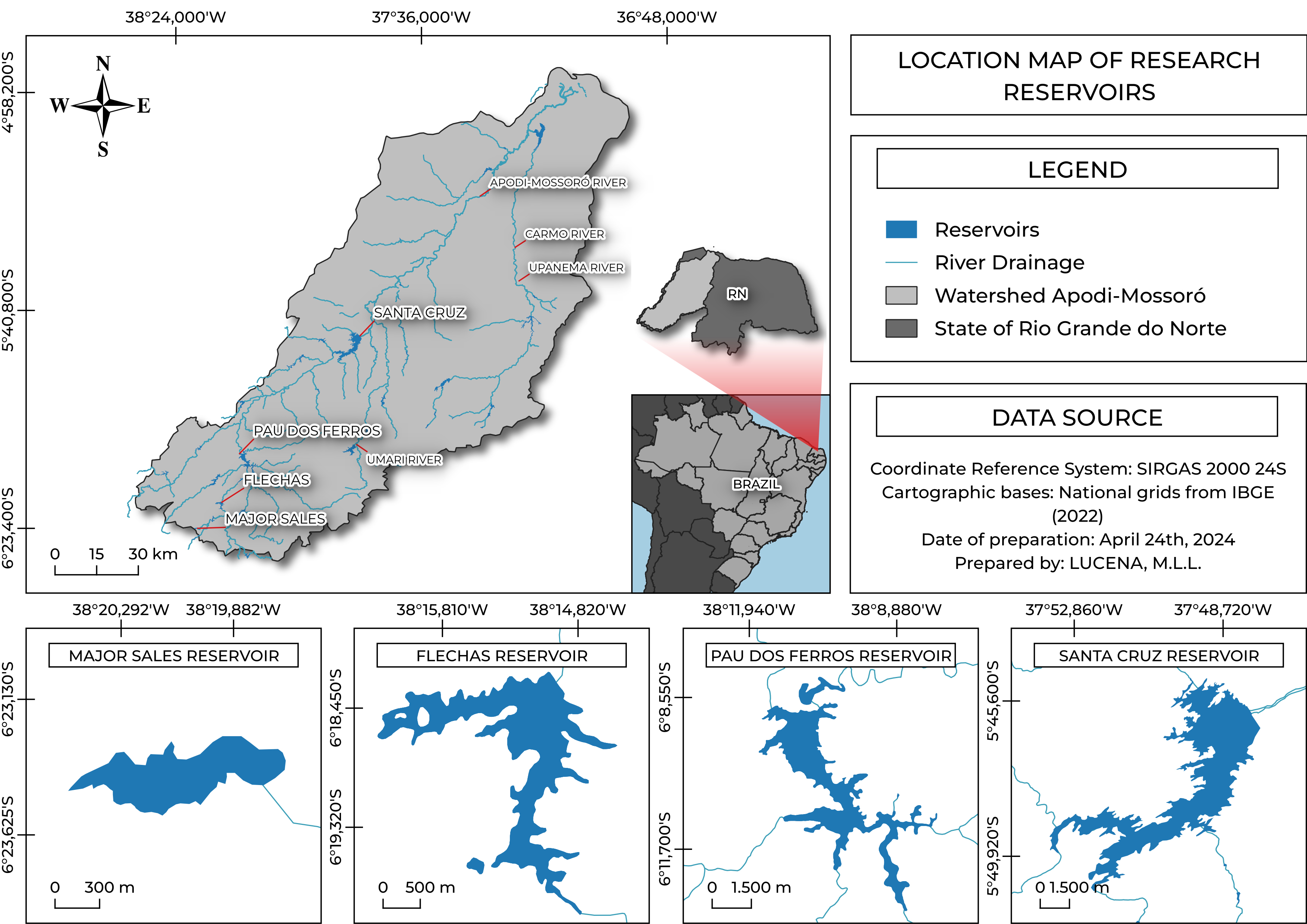 The hydrographic basins of the semiarid region of Brazil exhibit distinctive features, with intermittent river regimes prevailing (Nascimento, 2014; Felix, Paz, 2016). The phenomenon of intermittent rivers arises from the short duration of the rainy season, low annual rainfall indices, irregular precipitation patterns, and high evaporation rates (Marques et al., 2020). Given these issues, reservoirs have been constructed along river courses to store water to meet diverse human needs (Novais et al., 2022), including water supply, irrigation, agriculture, and industrial activities. However, these constructions are not without impacts on the functioning of local ecosystems and biodiversity.