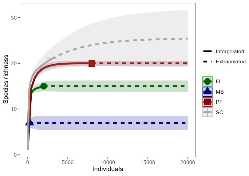 FIGURE 2| Species accumulation curve based on sampling effort in the cascade reservoir system along the Apodi-Mossoró River, semiarid region, Rio Grande do Norte State. Major Sales (MS), Flechas (FL), Pau dos Ferros (PF), and Santa Cruz (SC).