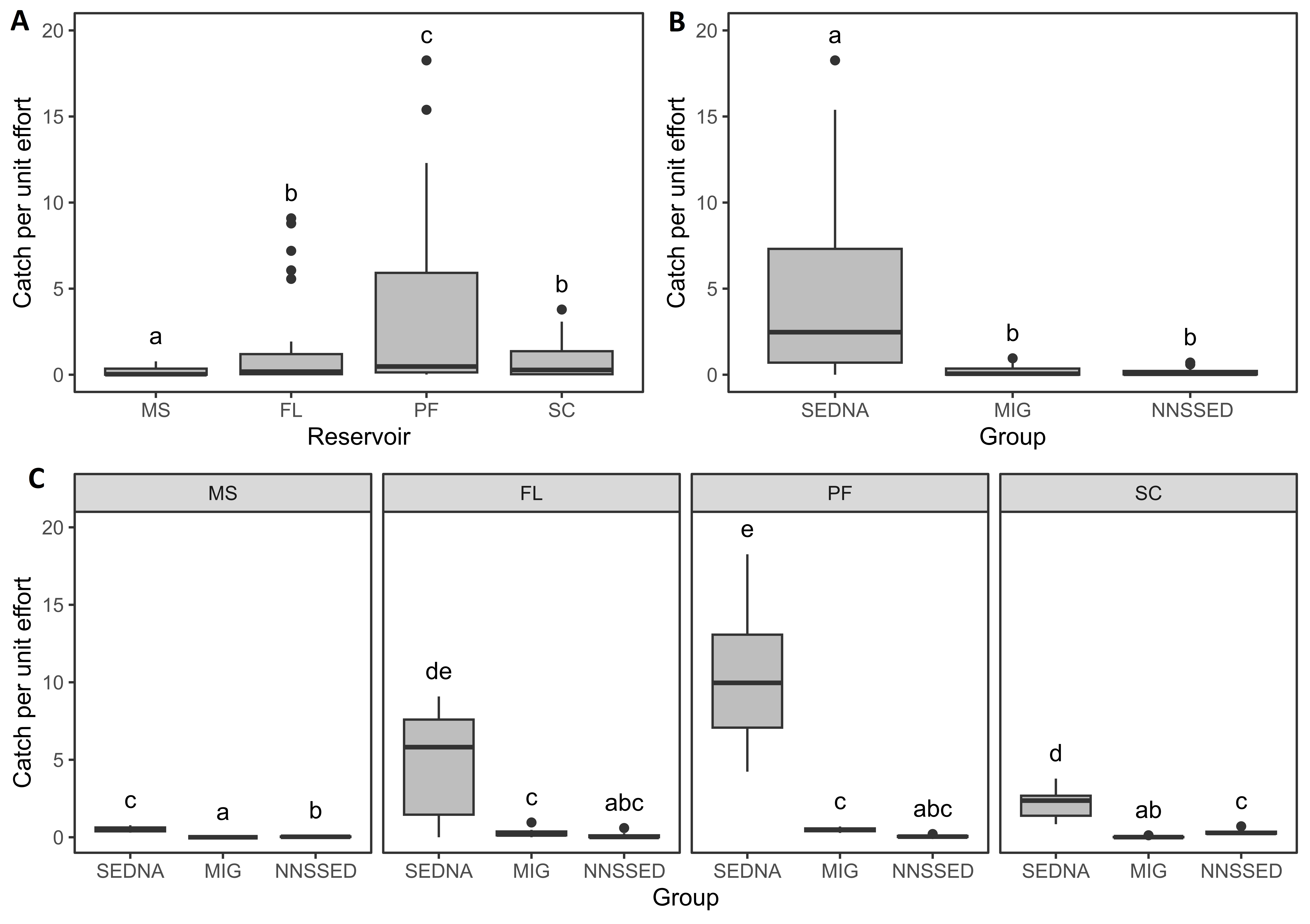 Sedentary species (SED) presented the highest average abundance (CPUE = 4.48), followed by migratory species (MIG) and non-native fish (NNA), which presented an average CPUEn of 0.19 and 0.13, respectively (GAMLSS; p < 0.05; Tab. 3; Fig. 4B). Analysis of the abundance of the three fish groups in each individual reservoir revealed a higher abundance of sedentary fish (SED). However, in the MS and SC reservoirs, the CPUE of non-native fish (NNA) surpassed that of migratory fish (MIG) (GAMLSS; p < 0.05; Tab. 3; Fig. 4C).
