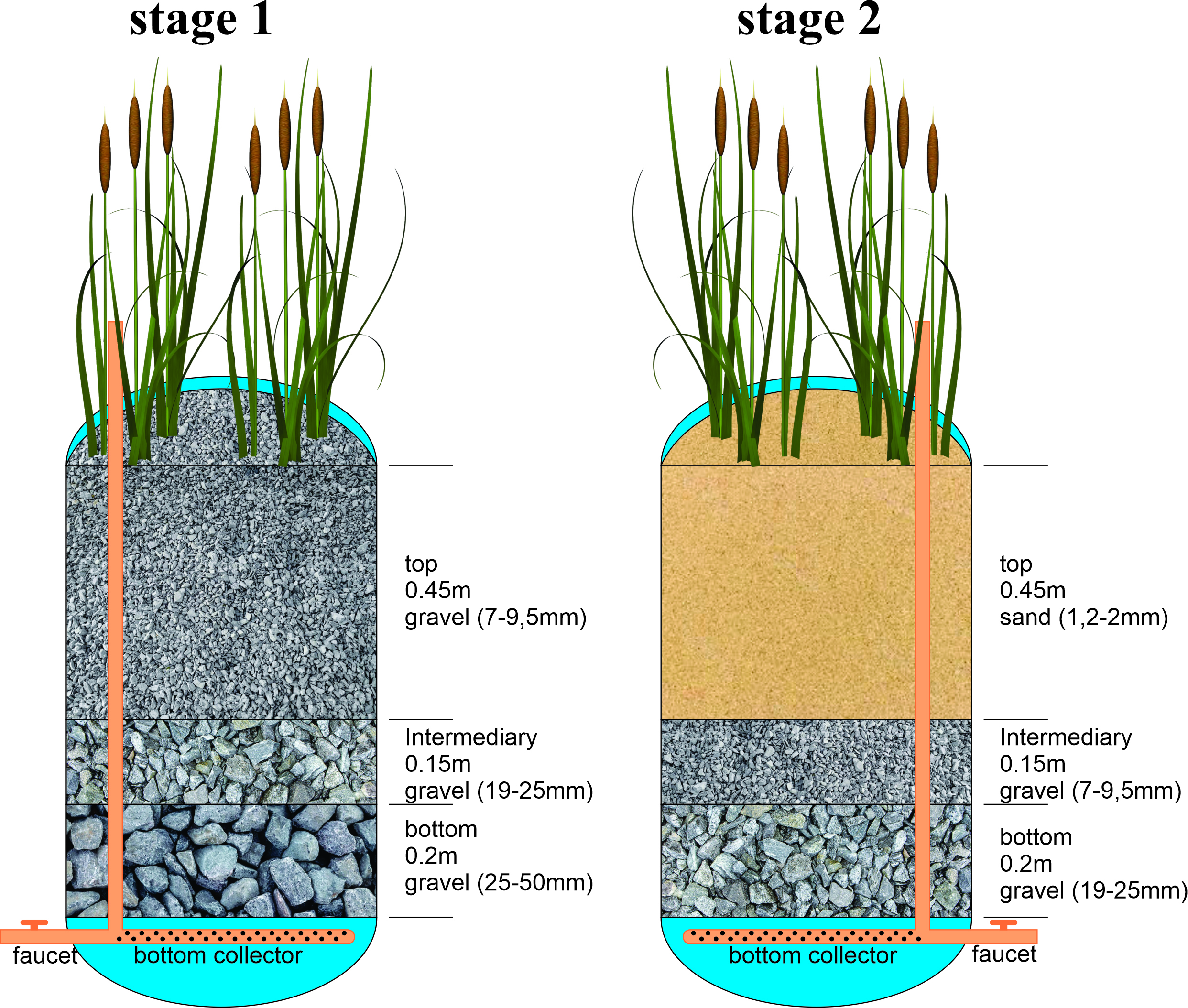 Construction of experimental built wetland treatment units with the vertical flow (VFCW). The making of the VFCW units followed some suggestions from the manual by Sezerino et al. (2018), with adaptations according to Silva et al. (2024). This study made them from two cylindrical high-density polyethylene (HDPE) containers (0.80 m in height X 0.55 m in diameter). The filter mass of the first stage was composed of 0.2 m of crushed stone (25–50 mm), 0.15 m of crushed stone (19–25 mm), and 0.45m of crushed stone (7–9.5 mm) (gravel). The second stage consisted of 0.2 m of gravel (19–25mm), 0.15m of gravel (7–9.5 mm), and 0.45 m of sand (1.2–2 mm). The adduction system consisted of 25 mm diameter polyvinyl chloride pipes and connections. The effluent was drained through an adductor system with perforations of 8.0 mm in diameter distributed along its entire extremity. The drainage pipe was positioned horizontally at the bottom of the bed, extending across the whole diameter of the units. The system contains a faucet for outputting the treated effluent at the bottom of the reservoir, installed 10 cm from the bottom (Fig. 1).