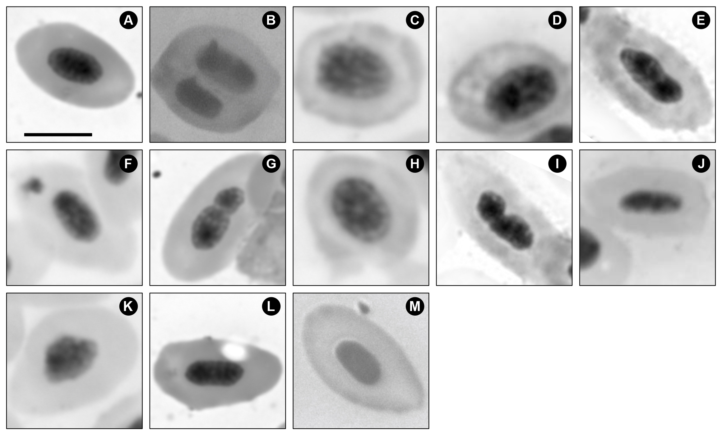 FIGURE 2| Photomicrograph of Astyanax altiparanae erythrocytes exposed to fluoxetine hydrochloride and stained with Giemsa. A. Normal Erythrocyte; B. Binucleate; C. Crenated Erythrocyte; D. Macronucleus; E. Blebbed; F. Micronuclei; G. Nuclear Constriction; H. Fragmented Nucleus; I. Lobed; J. Elliptocyte; K. Notched; L. Cytoplasmic Vacuole; M. Tear-Drop. Scale bar = 5 µm.