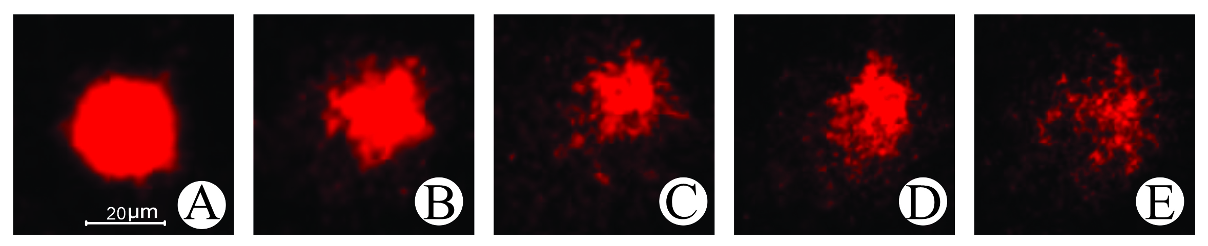 FIGURE 3| Damage to erythrocytes from Astyanax altiparanae specimens from the control group and following exposure to FLX was measured by the comet assay (Magnification 400x). A. Normal cell – damage 0; B. Damage 1; C. Damage 2; D. Damage 3; E. Damage 4. Scale bar = 20 µm.