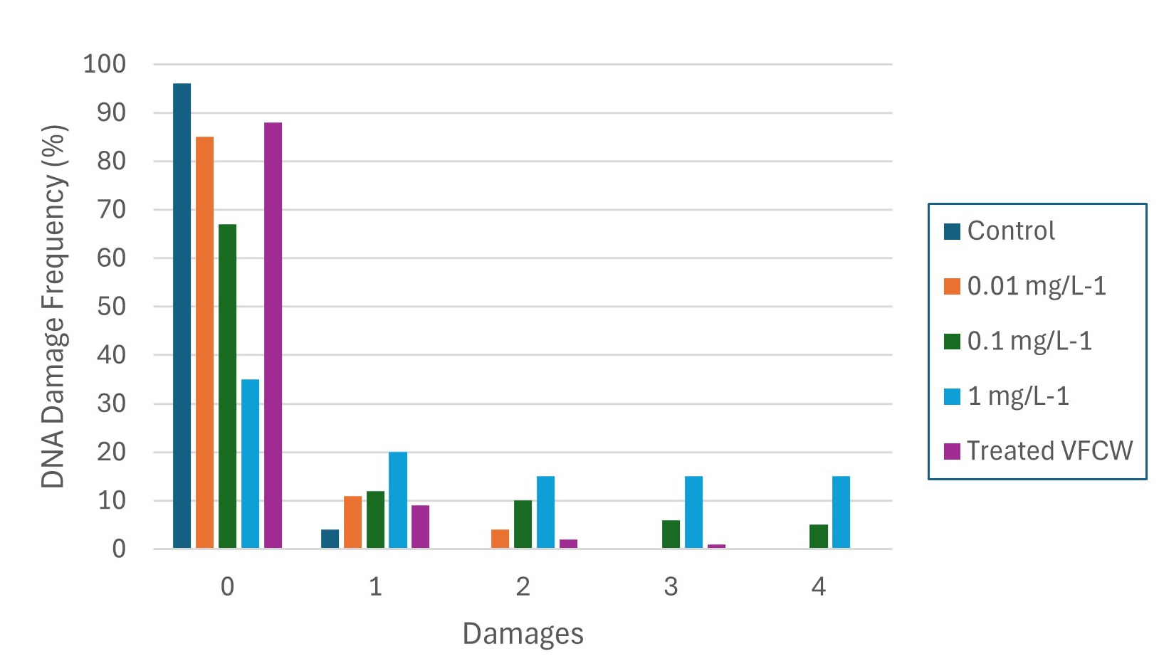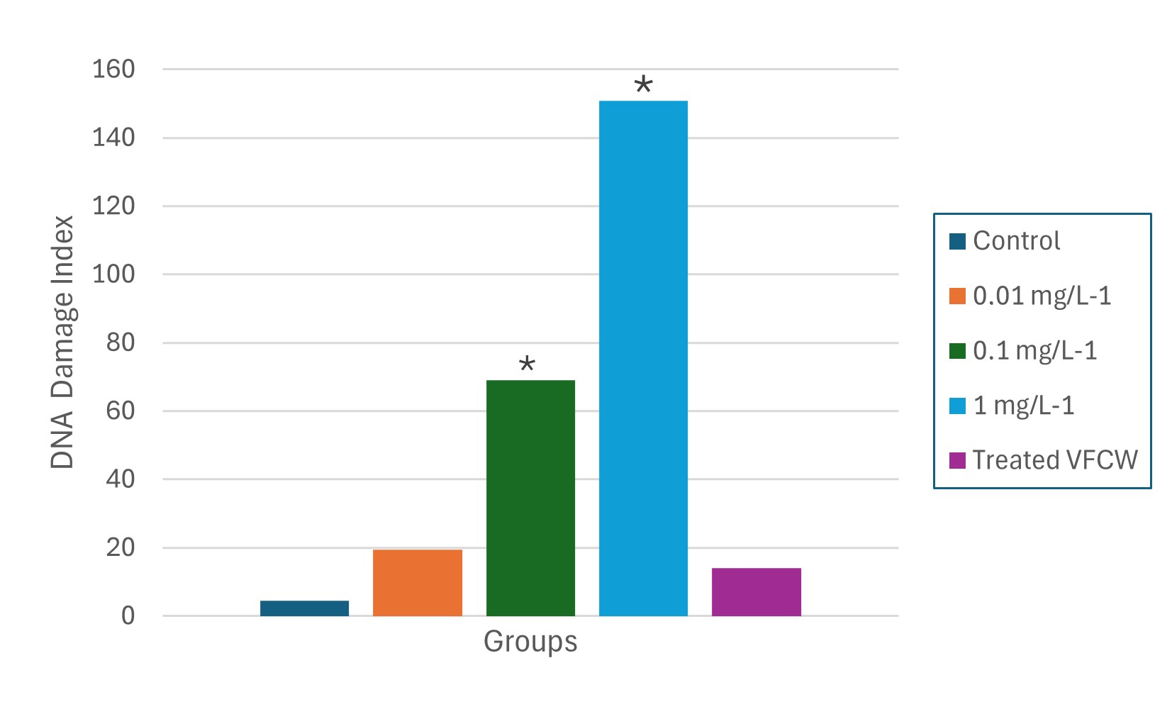 Comet assay. DNA damage classes 1, 2, 3 and 4 were detected through the comet assay only in the groups exposed to 0.1 and 1 mg L⁻¹ (Fig. 3). An apparent increase in DNA damage index (DI) was observed, with the highest values recorded at concentration 1 mg L⁻¹ of FLX. In contrast, the group treated by VCFW showed a DI close to that of the control group (Fig. 4).