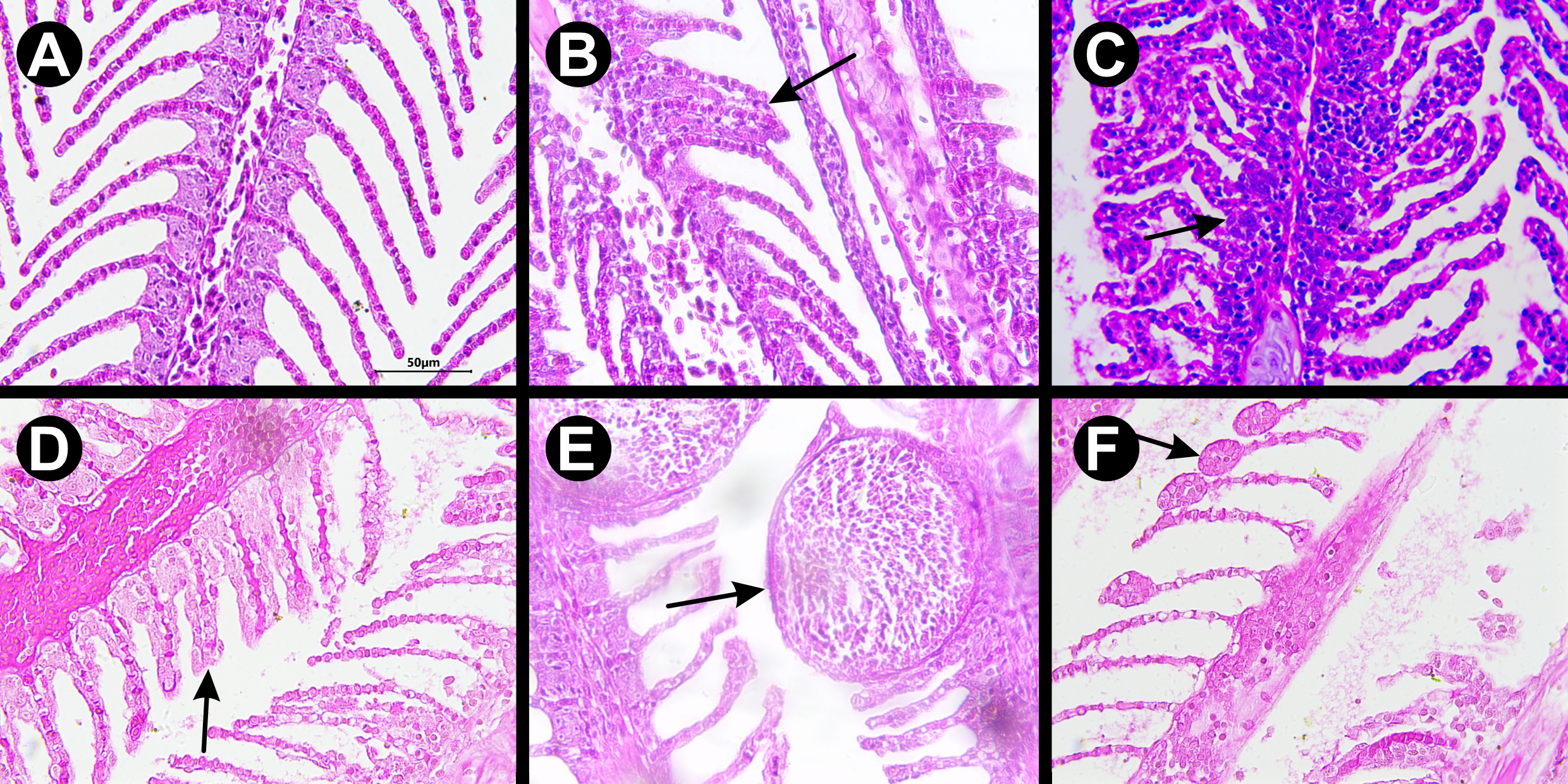 The vascular lesions identified in this study, including telangiectasias and aneurysms, may be linked to hemodynamic changes in the branchial lamellae due to increased blood flow, which can lead to the rupture of pillar cells and capillaries (Ahmed et al., 2013). These lesions are indicative of significant damage, potentially resulting in internal hemorrhages and respiratory dysfunction (Azadbakht et al., 2019; Hasan et al., 2022). The presence of telangiectasias further underscores the impact of FLX on the branchial microvasculature, as noted by Strzyżewska-Worotyńska et al. (2017).