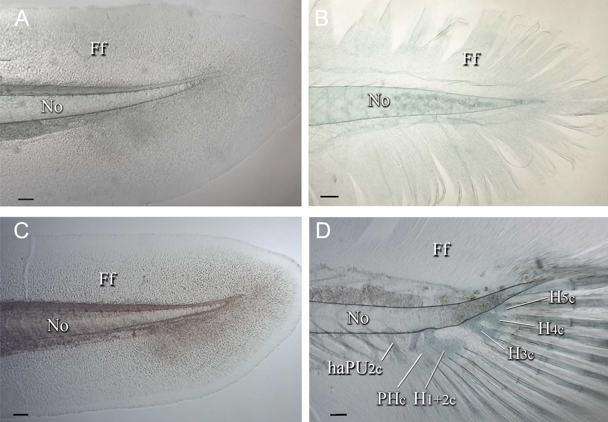 FIGURE 1| Caudal skeleton of Lophiosilurus alexandri; (A) MZUEL 5681, yolk sac stage, 7.9 mm SL; (B) MZUEL 5702, yolk sac stage, 7.5 mm SL; (C) MZUEL 5703, flexion stage, 8.2 mm SL; (D) MZUEL 5682, early postflexion stage, 9.1 mm SL. Ff: finfold; haPU2c: haemal arch of pre-ural 2 cartilage; H3c: hypural 3 cartilage; H4c: hypural 4 cartilage; H5c: hypural 5 cartilage; No: notochord; PH+H1 +2c: parhypural plus hypural 1 and hypural 2 cartilages. Scale bars = 100.0 µm.