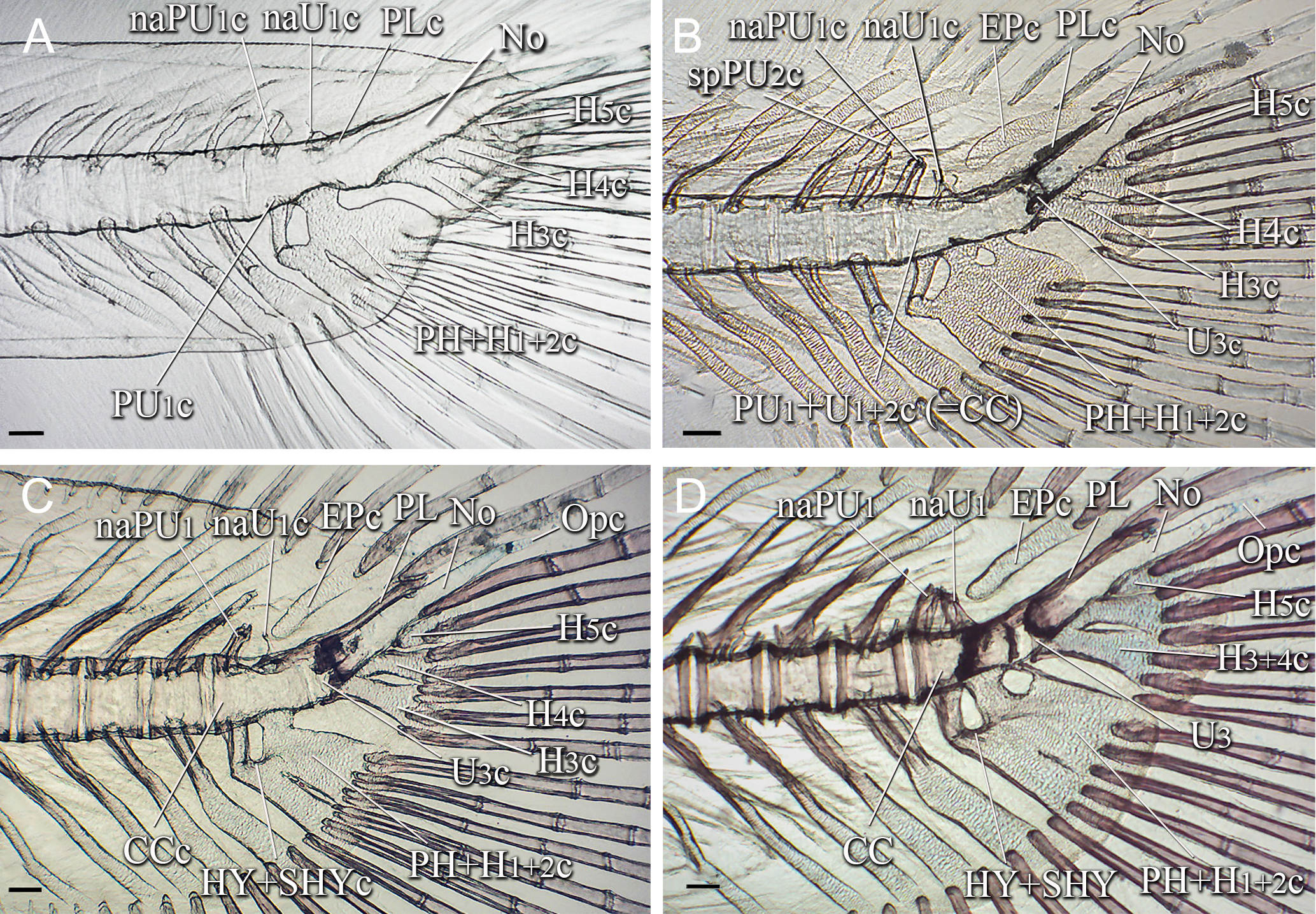 FIGURE 2| Caudal skeleton of Lophiosilurus alexandri in post-flexion stage; (A) MZUEL 5684, 11.1 mm SL; (B) MZUEL 5685, 11.4 mm SL; (C) MZUEL 5689, 14.2 mm SL; (D) MZUEL 5690, 14.9 mm SL. CC: compound centrum; EP: Epural; H3+4: hypural 3 plus hypural 4; H5: hypural 5; HY+SHYc: hypurapophysis plus secondary hypurapophysis cartilage; naPU1: neural arch of preural centrum 1; naU1: neural arch of ural centrum 1 cartilage; No: notochord; Opc: opisthural cartilage; PH+H1+2: parhypural plus hypural 1 and hypural 2; PL: pleurostyle; PU1+U1+2: preural centrum 1 plus ural centrum 1 and ural centrum 2; U3: ural centrum 3. Terminal “c” in abbreviations referring to cartilaginous structures. Scale bars = 100.0 µm.