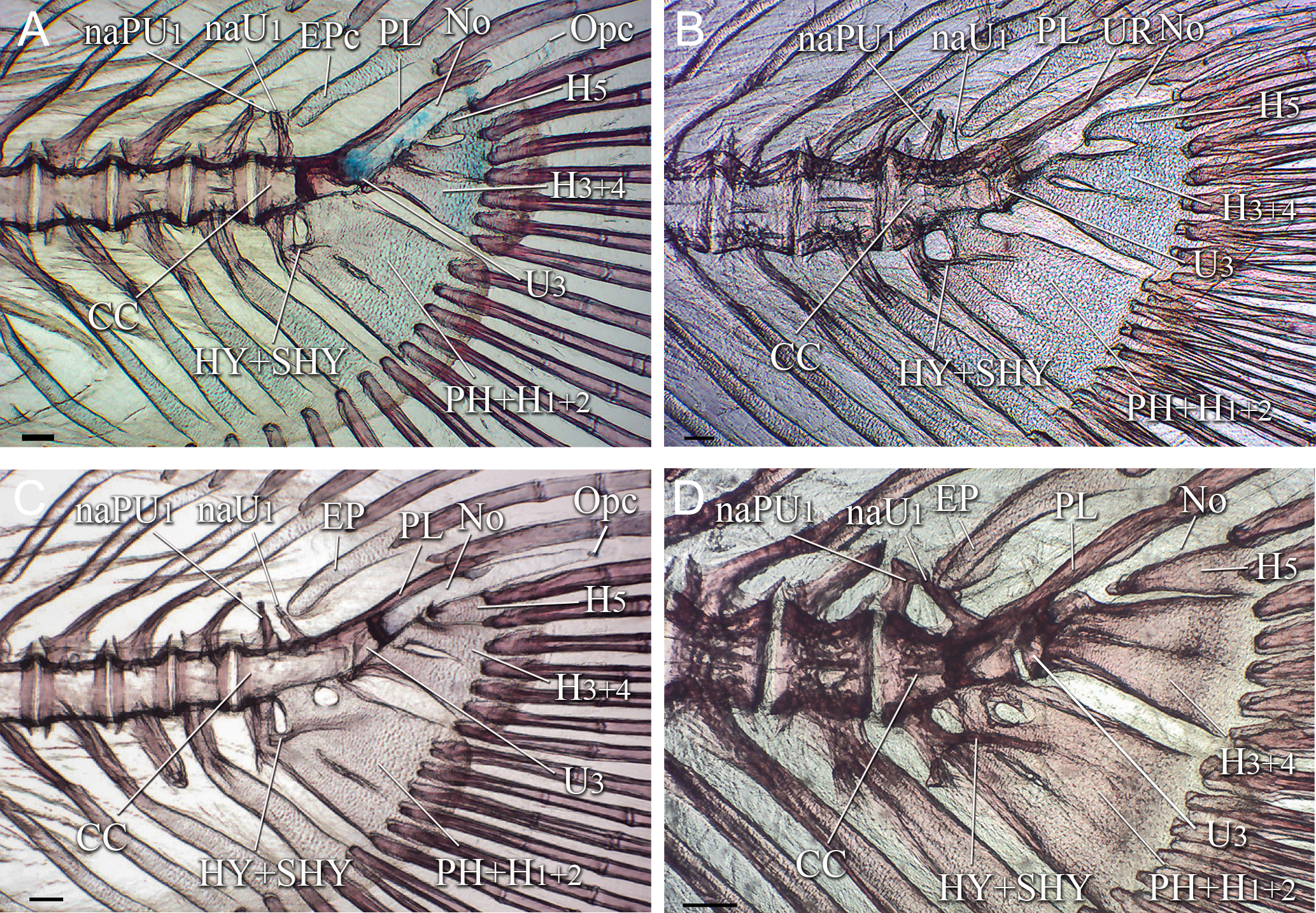 FIGURE 3| Caudal skeleton of Lophiosilurus alexandri in juvenile stage; (A) MZUEL 5691, 17.3 mm SL; (B) MZUEL 5692, 18.5 mm SL; (C) MZUEL 5693, 19.3 mm SL; (D) MZUEL 5694, 26.6 mm SL. CC: compound centrum; EP: epural; H3+4: hypural 3 plus hypural 4; H5: hypural 5; HY+SHY: hypurapophysis plus secondary hypurapophysis; naPU1: neural arch of preural centrum 1; naU1: neural arch of ural centrum 1; No: notochord; Opc: opisthural cartilage; PH+H1+2: parhypural plus hypural 1 and hypural 2; PL: pleurostyle; U3: ural centrum 3. Terminal “c” in abbreviations referring to cartilaginous structures. Scale bars = 100.0 µm.