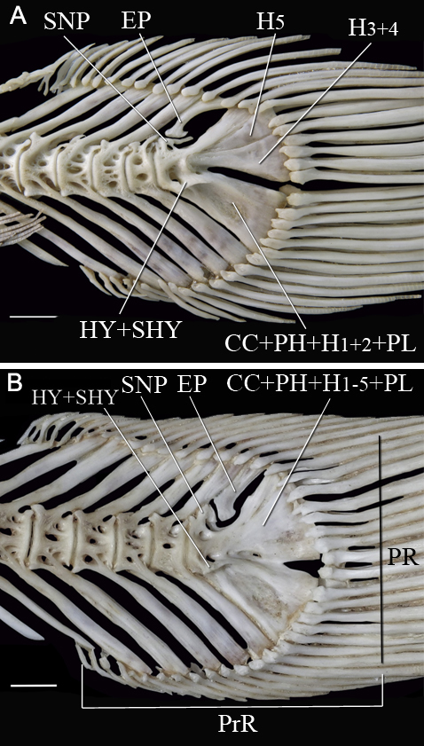 FIGURE 4| Caudal skeleton of Lophiosilurus alexandri in adult stage; (A) MZUEL 16469, 330.4 mm SL; (B) MZUSP 40223, 440.0 mm SL. CC+PH+H1-2+PL: Compound terminal centrum plus parhypural plus hypurals 1-2 and pleurostyle; CC+PH+H1-5+PL: Compound terminal centrum plus parhypural plus hypurals 1-5 and pleurostyle; EP: Epural; H3+4: Hypural 3 plus hypural 4; H5: Hypural 5; HY+SHY: hypurapophysis plus secondary hypurapophysis; PrR: Procurrent caudal-fin rays; PL: Pleurostyle; SNP: Specialized neural process. Scale bars = 10.0 mm.