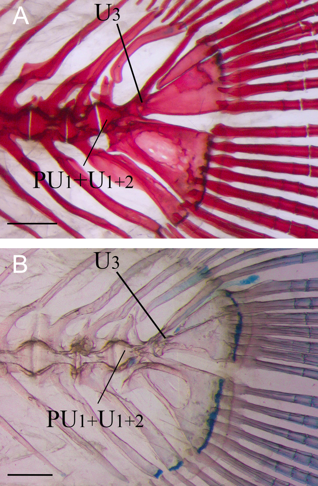 FIGURE 5| Caudal skeleton of adults of (A) Microglanis garavelloi, MZUEL 3288, 27.8 mm SL; (B) Microglanis carlae, MZUEL 5021, 30.4 mm SL. PU1+U1+2: Preural 1 plus ural centrum 1 and ural centrum 2; U3: Ural centrum 3. Scale bars = 1.0 mm.
