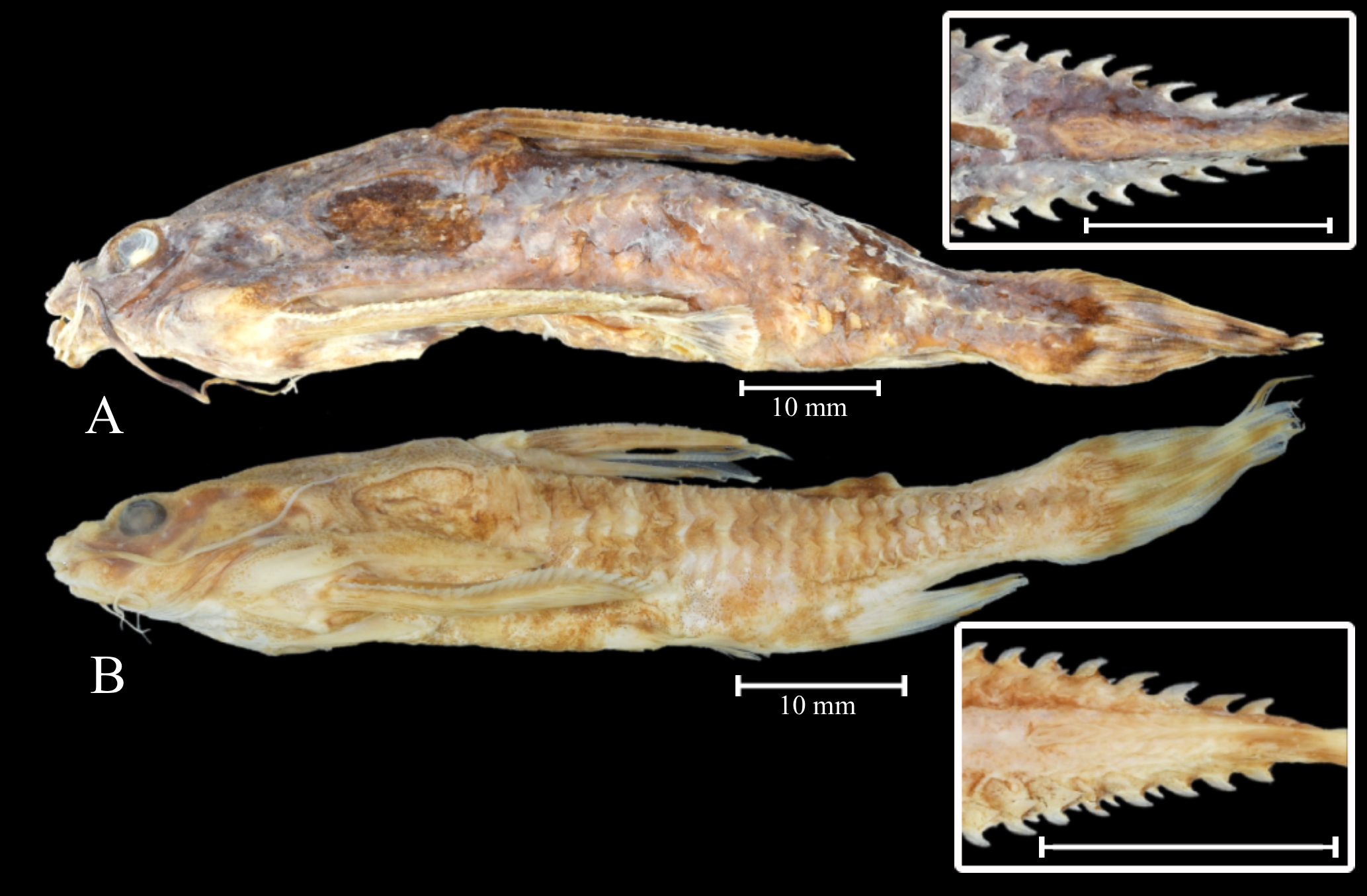 FIGURE 1| Samples used in this study: A. Astrodoras asterifrons, MZUEL 17813,72.7 mm SL, from Negro River, near Anavilhanas; B. Astrodoras sp., MZUEL 17800 57.9 mm SL, Negro River at Barcelos. The caudal peduncle in dorsal view is presented in the boxes.