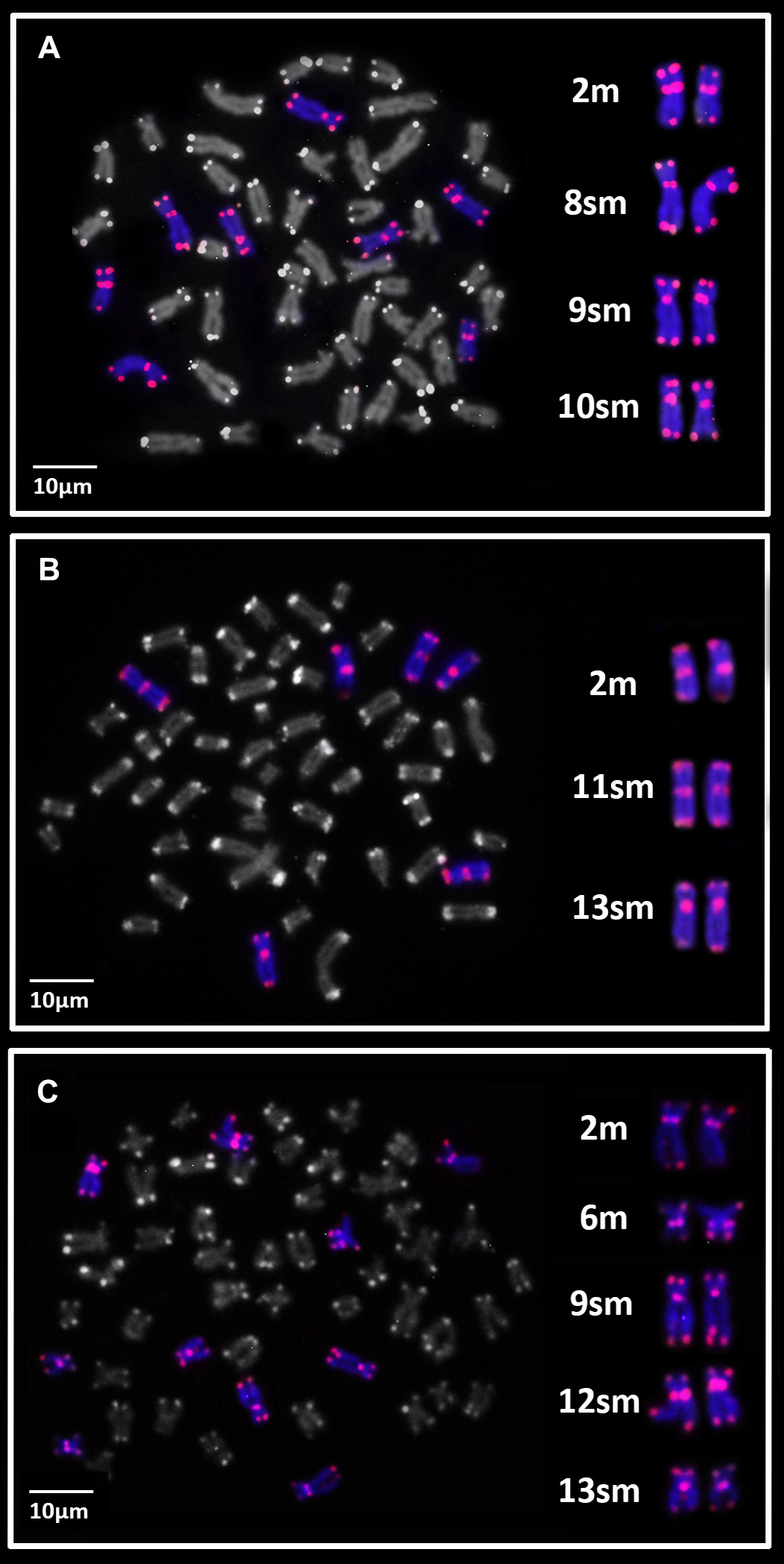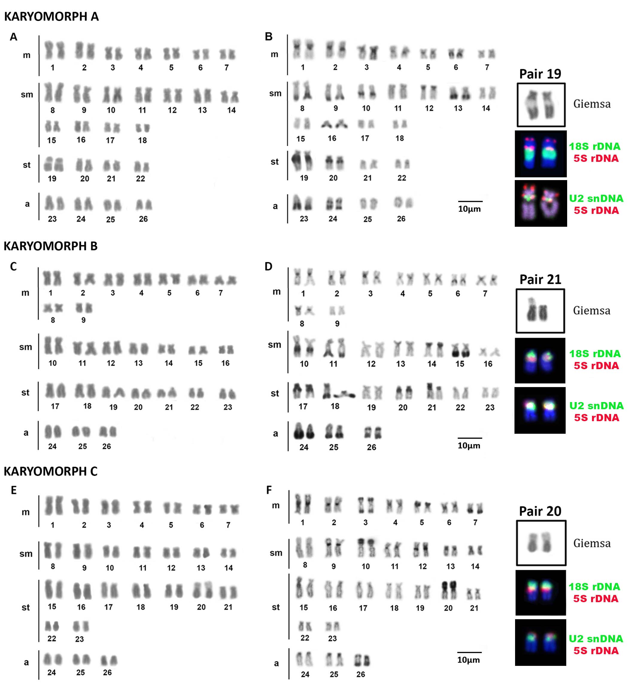Astrodoras asterifrons. Three of the eight specimens collected in the Negro River, near the Anavilhanas archipelago, exhibited 2n = 52 chromosomes and a karyotype composed of 14m + 22sm + 8st + 8a chromosomes for both sexes. These individuals were designated as Karyomorph A in this study (Fig. 2A). C-banding revealed CH blocks in pericentromeric regions of chromosome pairs 1m, 2m, 3m, 4m, and 5m; interstitial blocks on the long arm of the chromosome pairs 6m, 10sm, 19st, and 20st; terminal blocks on the short arm of chromosome pair 12sm; and terminal blocks on the long arm of chromosome pairs 8sm, 9sm, 13sm, 16sm, and 23a. The chromosome pair 24a exhibited interstitial CH on the long arm (Fig. 2B). FISH with 18S rDNA probes revealed a single site on the long arm of chromosome pair 19st (Fig. 2B – box). FISH with 5S rDNA probes revealed two sites on chromosome pair 19st: one site on the terminal position of the short arm and another site on the proximal position of the long arm (Fig. 2B – box). FISH with telomeric probes (TTAGGG)n showed fluorescent signals at the terminal positions of all chromosomes. Additionally, interstitial telomeric sites (ITSs) were observed in the chromosome pairs 2m, 8sm, 9sm, and 10sm (Fig. 3A). The U2 snDNA sites were detected in the long arm of the chromosome pair 19st (Fig. 2B – box).