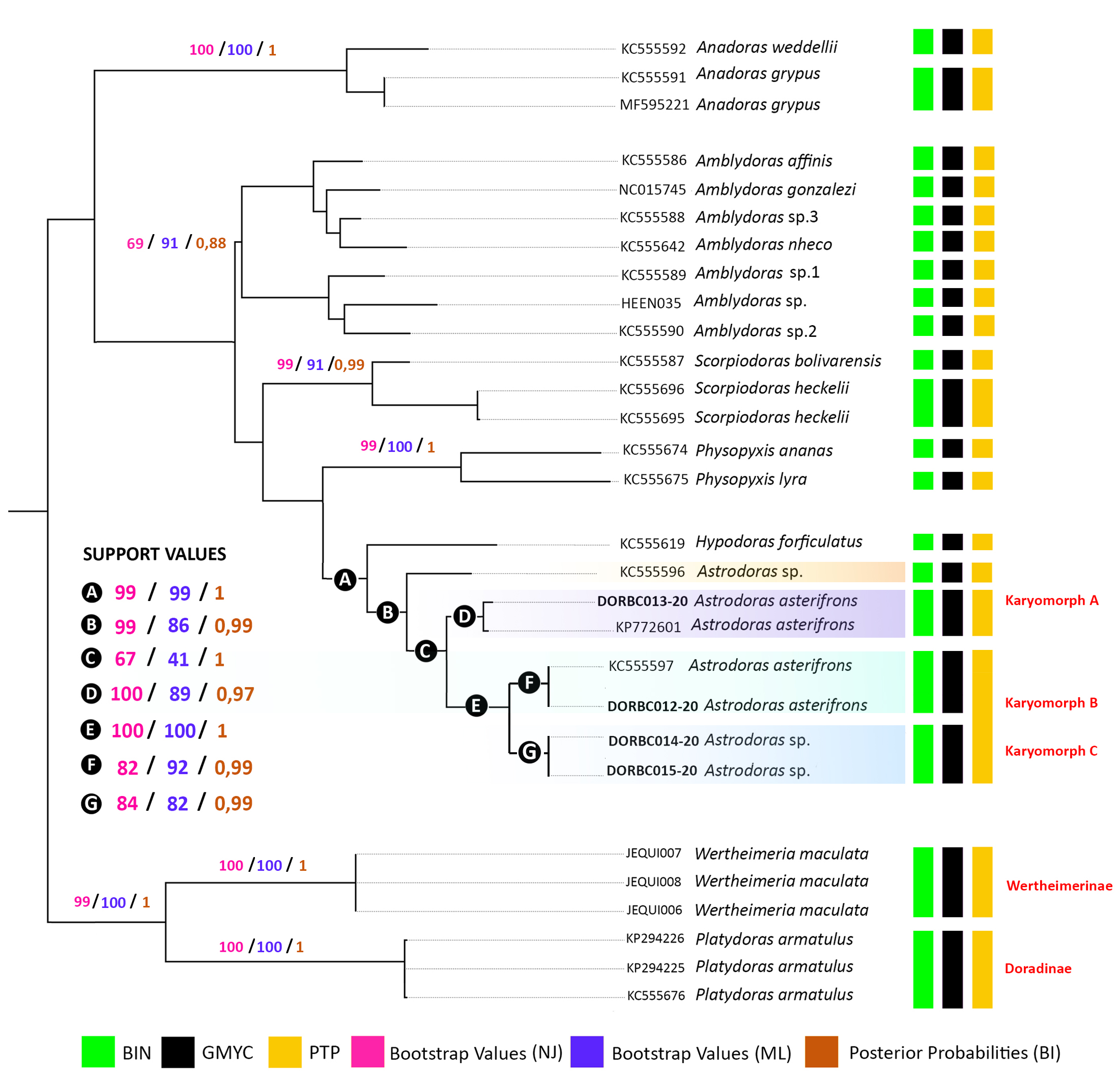 Molecular species delimitation analysis based on a fragment of the mtDNA COI gene. The COI sequences of obtained from seven specimens of Astrodoras resulted in a 604 bp dataset, with no deletions, insertions, or stop codons. The NJ, ML, and BI methods produced similar topologies, revealing seven major clades with high support values (above 90% bootstrap and 0.9 posterior probability): Wertheimeria and Platydoras (outgroups), Scorpiodoras, Physopyxis, Anadoras, Amblydoras affinis, Amblydoras sp., and Hypodoras + Astrodoras. The Astrodoras specimens from our sample were subdivided into three well-supported clades, corresponding to the three karyomorphs identified in cytogenetic analyses (A, B, and C). The specimens of Astrodoras asterifrons from near Anavilhanas correspond to Karyomorph A and B, while Astrodoras sp. corresponds to Karyomorph C.