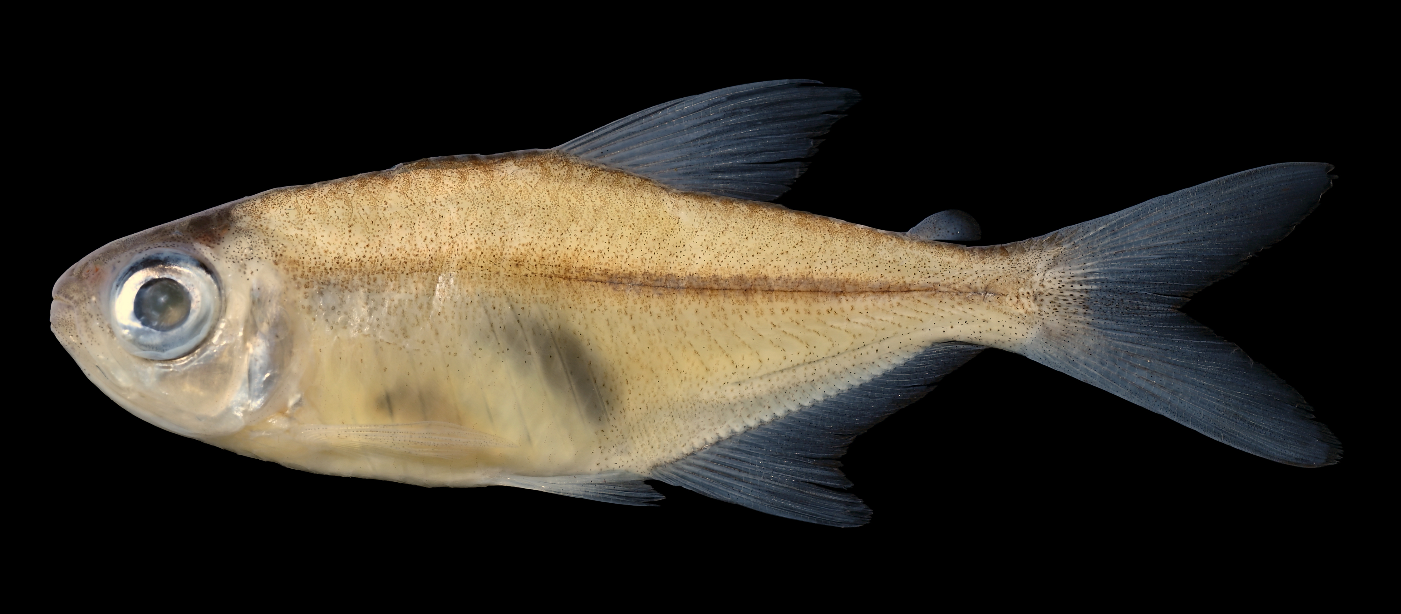 Coloration in alcohol. Ground color light beige. Snout and dorsal portion of head light brown, with high concentration of scattered melanophores. Dark background color over predorsal scales. Small melanophores present on maxilla and lower jaw, scattered melanophores on fifth to sixth infraorbitals and upper half of the opercle. Guanine on opercle, infraorbitals, and sides of body. Humeral and caudal peduncle spots absent. Slight and narrow longitudinal dark stripe along midline of body, originating at five to seven scales after opercle, covering less than one scale. Scales from the laterodorsal portion of the body with a high concentration of melanophores near the posterior margin, with an overall darker coloration to dorsal portion of body. Abdominal region slightly pigmented, some scattered melanophores in region of anal-fin base. Dorsal, adipose, pectoral, pelvic, anal and caudal fins hyaline, with scattered melanophores on interradial membranes. Melanophores outline the rays and form horizontal, narrow lines on the fins.