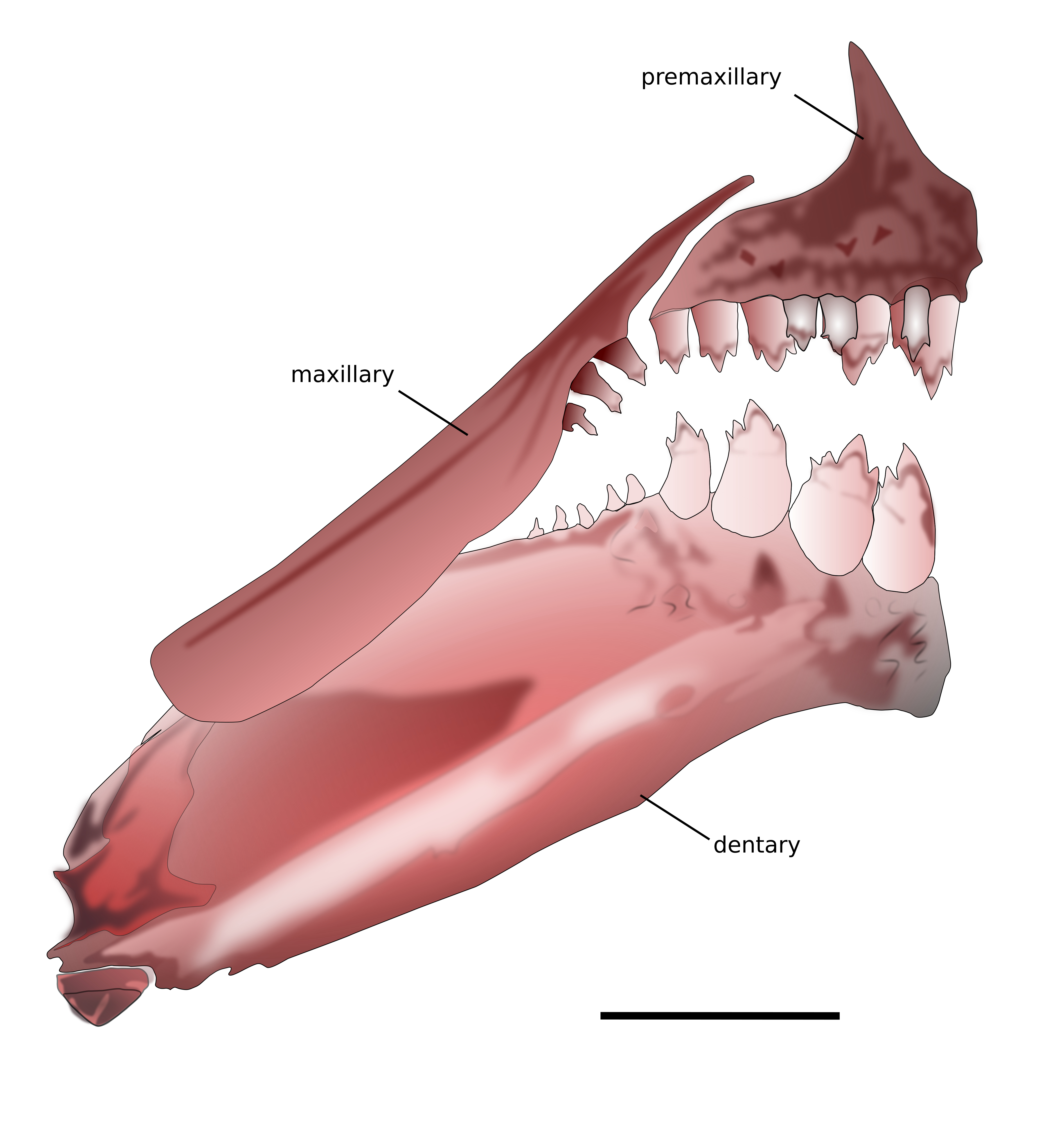 FIGURE 2| Hemigrammus serrazul, paratype, CPUFMT 8136, 37.9 mm SL. Upper and lower jaws, left side, lateral view. Scale bar = 1 mm.