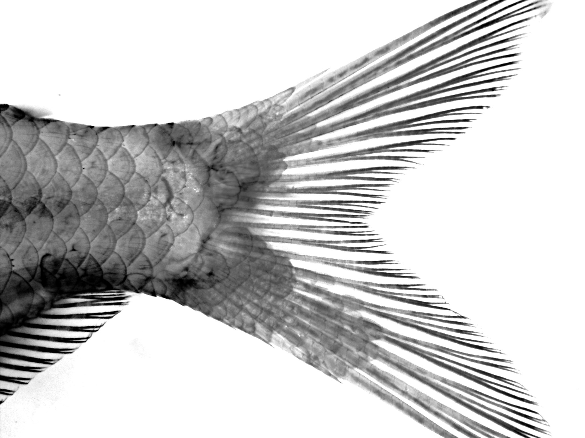 Scales cycloid, with two to six radii diverging from focus to posterior portion of scale; circuli weakly marked. Lateral line incomplete, with 12*(6), 13(4), 14(2), 15(9), 16(5), 17(3), or 18(2) perforated scales, longitudinal scale series including pored scale, 32*(4), 33(9), 34(9), or 35(6). Scales rows between dorsal-fin origin and lateral line 5*(30). Scales rows between lateral line and pelvic-fin 3(3) or 4*(27). Predorsal scales 9(2), 10*(13), 11(10), 12(4), or 13(1). Circumpeduncular scales 14*(30). Single row of 4–5 scales covering base of anal-fin rays. Base of caudal-fin scaled; squamation slightly more developed on lower caudal fin lobe, covering at least one-third of lobe. Scales on the caudal fin smaller that the scales covering the body (Fig. 3).