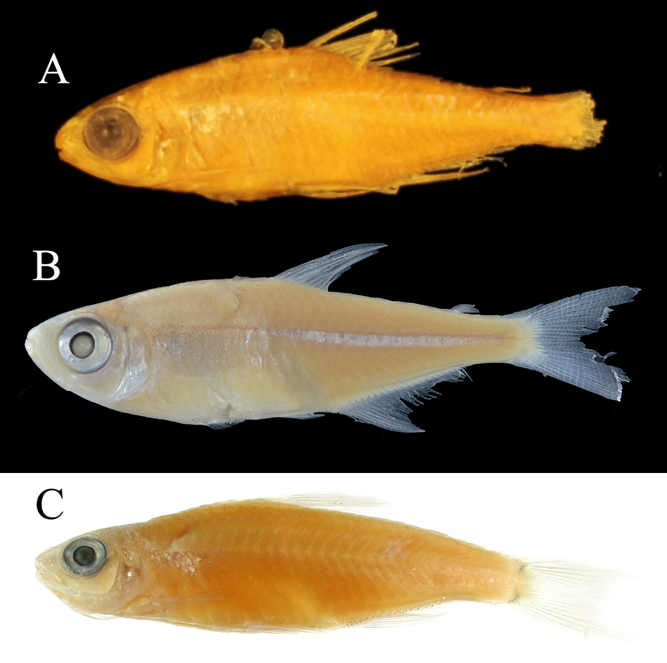 FIGURE 8| Hemigrammus species without black markings sensu Géry (1977): A. Hemigrammus erythrozonus, FMNH 53546, holotype, 24.0 mm SL; B. Tetragonopterus gracilis, NMW 68066, syntype, 27.5 mm SL; C. Hemigrammus mimus, CAS 47759, holotype, 27.8 mm SL. Credits: A. © Field Museum of Natural History – CC BY-NC 4.0; B. Fernando R. Carvalho; C. © 2001 California Academy of Sciences.